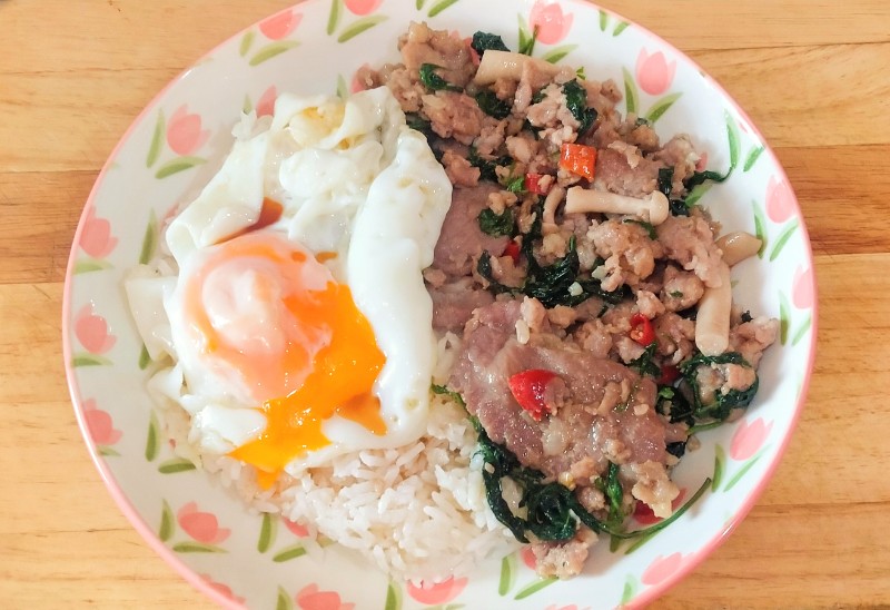 ข้าวกะเพราสันคอหมูสับไข่ดาว 🍛🌿🍳