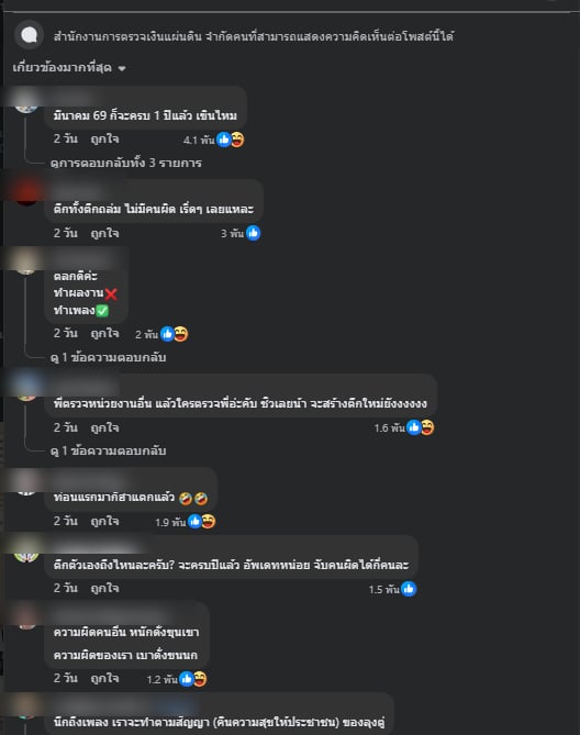 หลังจากเพจเฟซบุ๊ก “สำนักงานการตรวจเงินแผ่นดิน” เปิดให้ชม MV เพลง “ปณิธานคนตรวจเงิน” เพื่อสะท้อนบทบาท ภารกิจ และอุดมการณ์ของบุคลากรในการพิทักษ์รักษาผลประโยชน์ของประเทศชาติ จนมีคนเข้าไปดูกว่า 1.4 ล้านครั้ง ล่าสุด ในโลกออนไลน์ได้เกิดกระแสฮือฮาอีกครั้ง เมื่อเพจ “สำนักงานการตรวจเงินแผ่นดิน” จู่ ๆ ก็ปิดการแสดงความเห็นเมื่อช่วงเช้าวันที่ 23 ก.พ. 68