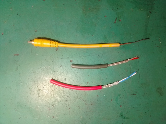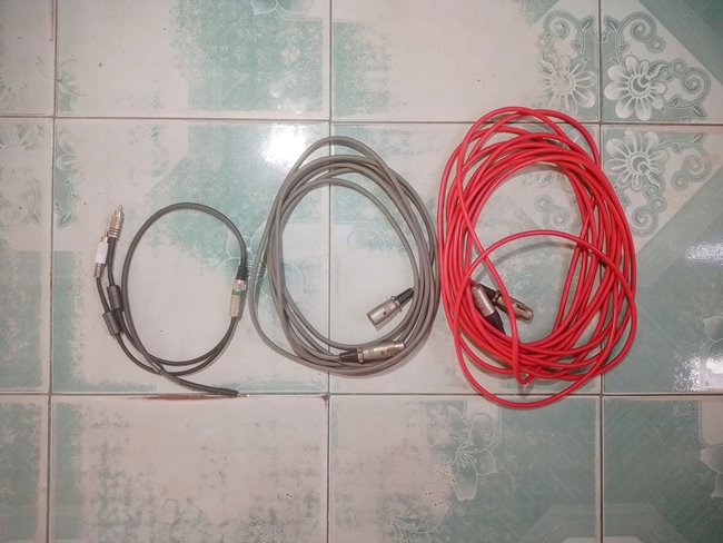 ซ้ายมือเป็นสายแจ็ค 3.5 to RCA ที่ผมนำของเก่าทั้งสาย แจ็ค และแกนเฟอร์ไรต์บีดมาประกอบกันใช้แทนสายสีเหลืองที่เสื่อมสภาพไป สายใช้เป็นยี่ห้อ Sommer + Canare ตรงกลางเป็นสายไมค์/เครื่องดนตรียี่ห้อ Canare ขวาสุดเป็นสายไมค์ใช้สายยี่ห้อ Dynacom สายนี้ราคาถูกคุณภาพดีบรรดานักดนตรีนิยมใช้ครับ