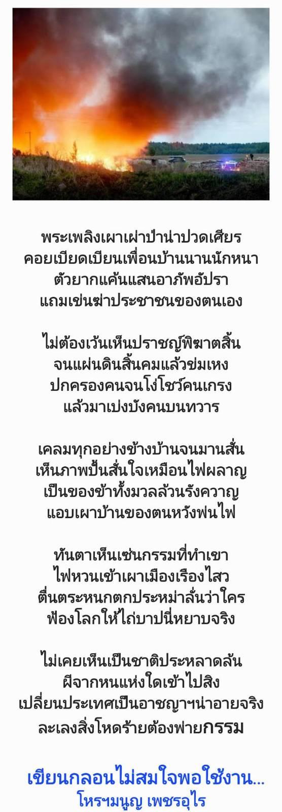 @ สัตว์โลก โศกตรอมตรม...ทุกข์ระทม น้ำมือใคร ผู้ใด ก่อกรรมไว้..................โลกหมองไหม้ ทุกวารวัน @ เหตุขาด รักเมตตา.........ใช่ดินฟ้า แกล้งเดียดฉันท์ โลภหลง โกรธเกลียดกัน.....นำโทษทัณฑ์ พาบรรลัย