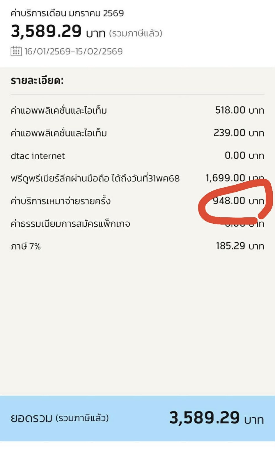 ปกติจ่าย 2000 กว่าบาทก็ว่าหนักแล้ว อยู่ดีๆเดือนนี้ มีค่าบริการอะไรมาก็ไม่รู้ ถ้ายกเลิกไม่ได้ก็จะเปลี่ยนค่ายรู้สึกว่าเดือนนึงค่าโทรศัพท์เยอะเกินไป