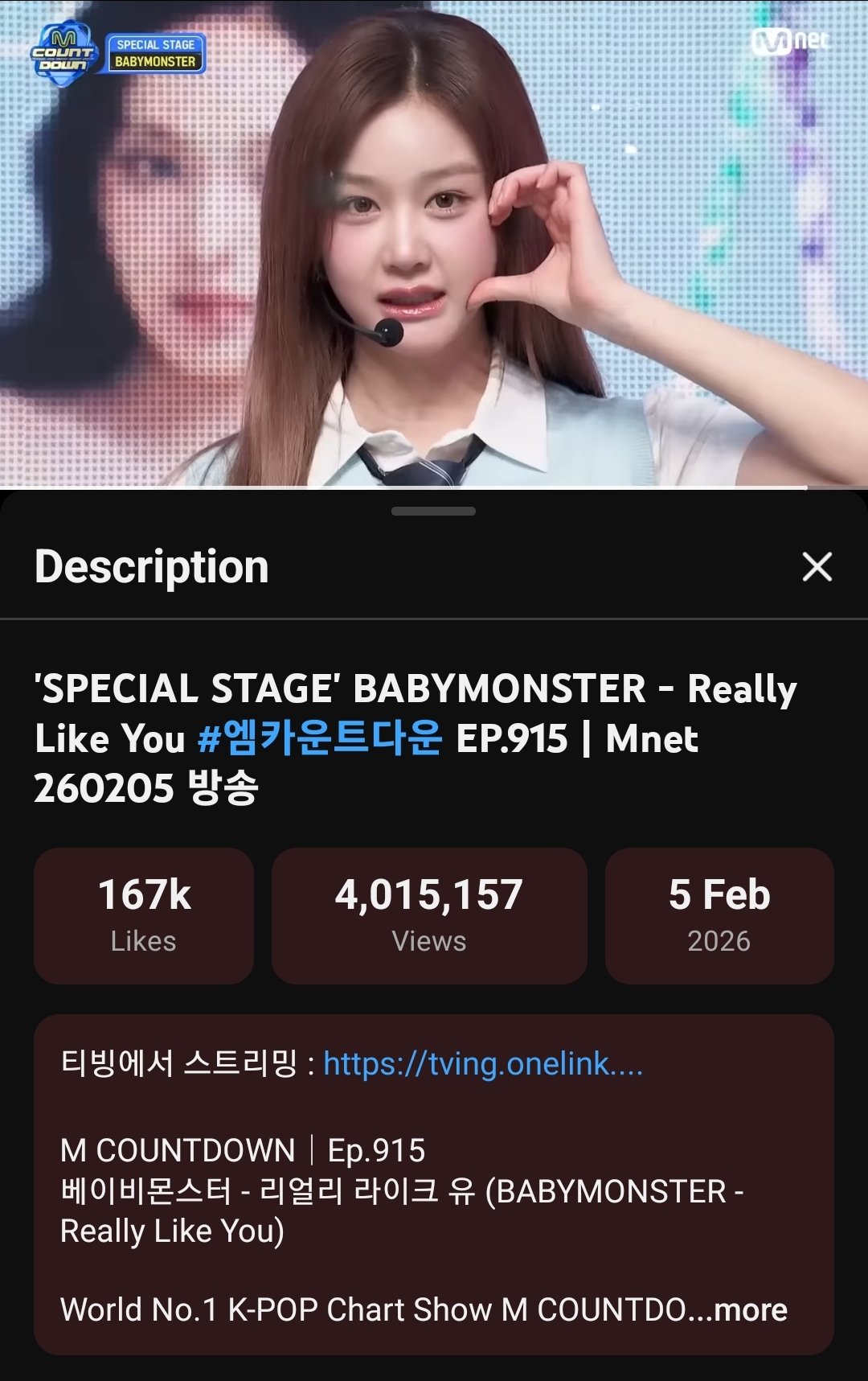 คลิป 'SPECIAL STAGE' BABYMONSTER - Really Like You มียอดวิวทะลุ 4 ล้านวิว ​นับเป็นคลิป Performance ที่ยอดวิวสูงสุดของปี 2026 ด้วย ​สำหรับ