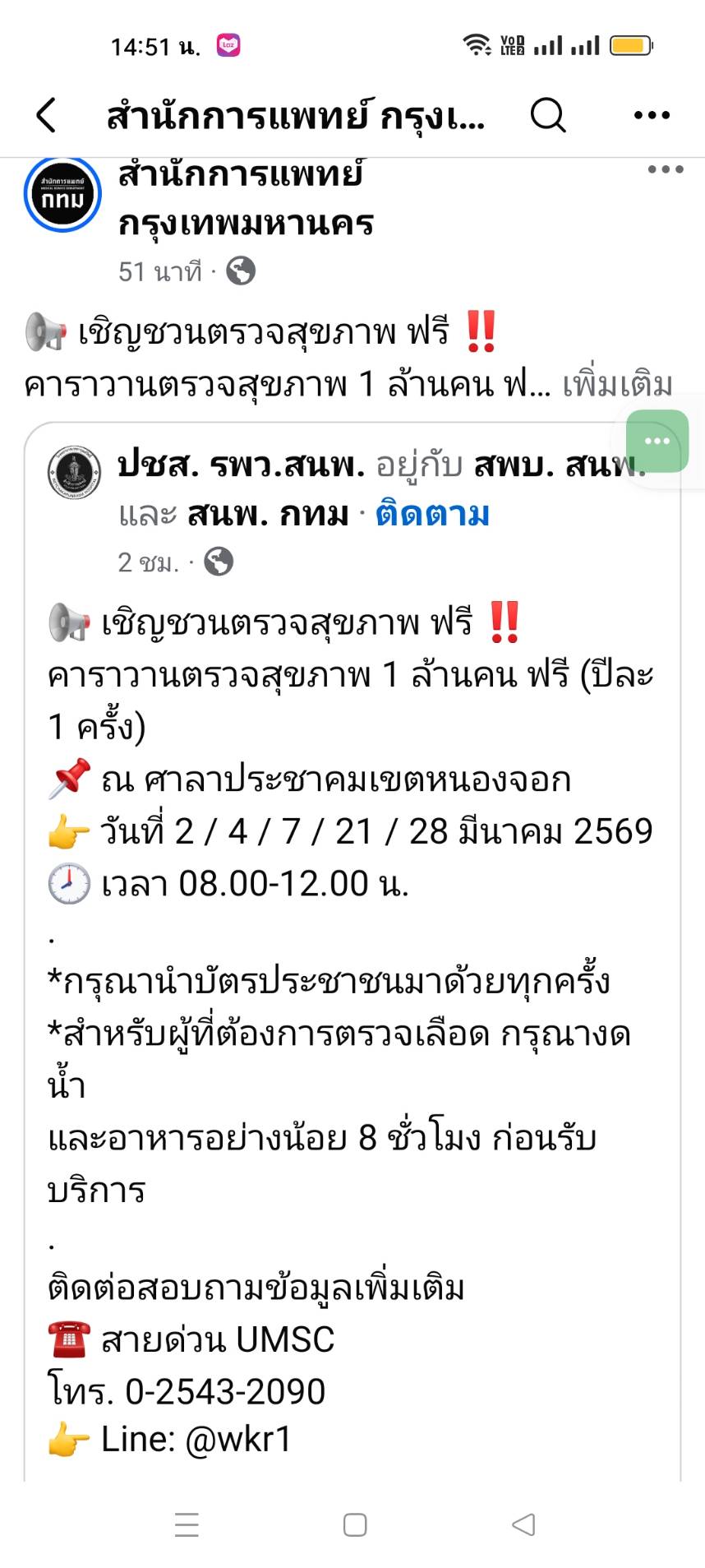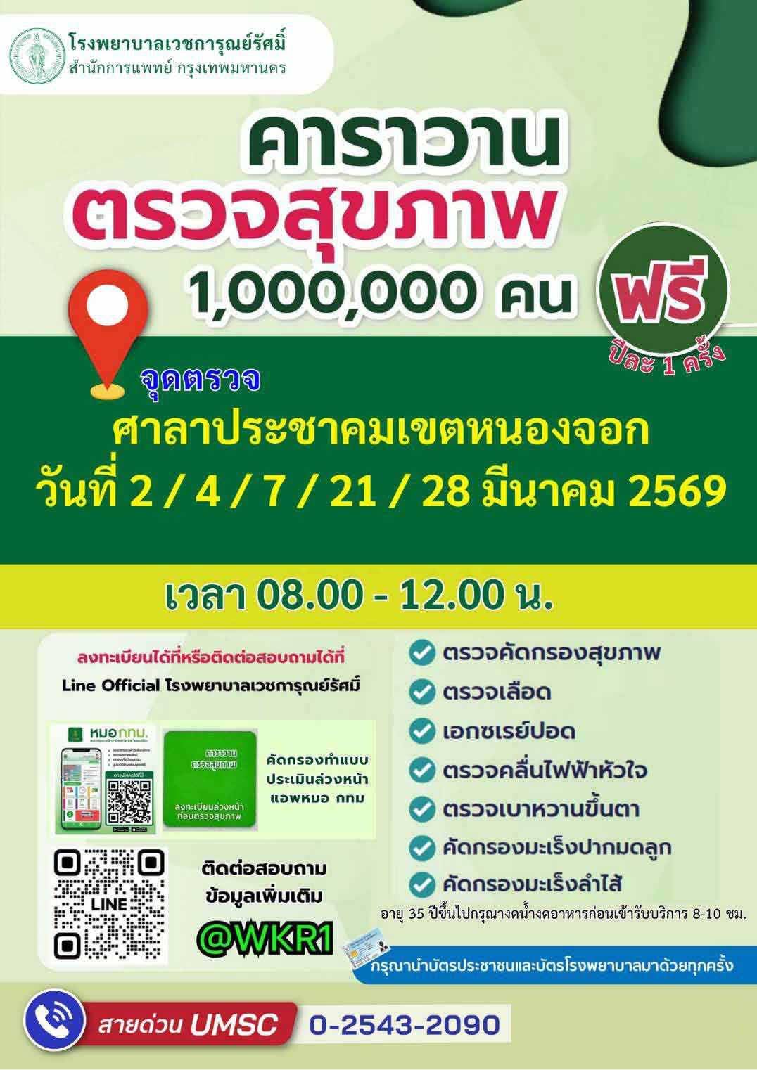 ตรวจสุขภาพฟรี ของ กทม. วันที่ 2, 4, 7, 21, 28 มีนาคม ที่ศาลาประชาคม เขตหนองจอกค่ะ