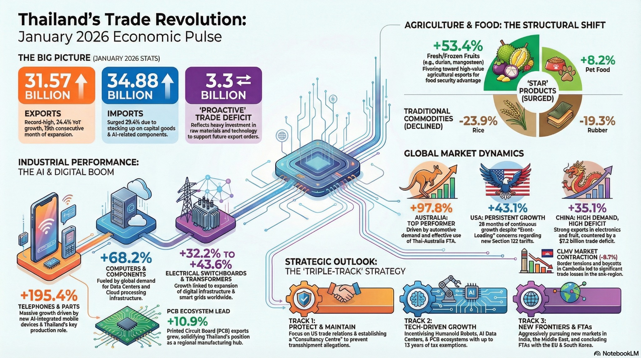 **การขาดดุลการค้าเชิงรุก (Proactive Deficit) ไทยขาดดุลการค้า 3,303.4 ล้านดอลลาร์สหรัฐ ซึ่งไม่ใช่การเสียสมดุลจากการบริโภคฟุ่มเฟือย แต่เกิดจากการ **เร่งนำเข้าสินค้าทุนและวัตถุดิบ** (เช่น เครื่องจักร ชิ้นส่วนอิเล็กทรอนิกส์ขั้นสูง และสารกึ่งตัวนำ) เพื่อนำมาประกอบและเตรียมความพร้อมสำหรับภาคการผลิตอุตสาหกรรมไฮเทคในอนาคต