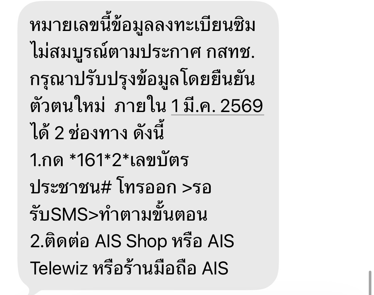 มีใครได้รับ SMS จาก AIS ไหมคะ ว่าหมายเลขนี้ข้อมูลลงทะเบียนซิมไม่สมบูรณ์ตามประกาศ กสทช. กรุณาปรับปรุงข้อมูลโดยยืนยันตัวตนใหม่ มันมาจากAISจริงๆใช่ไหม แล้วต้องดำเน