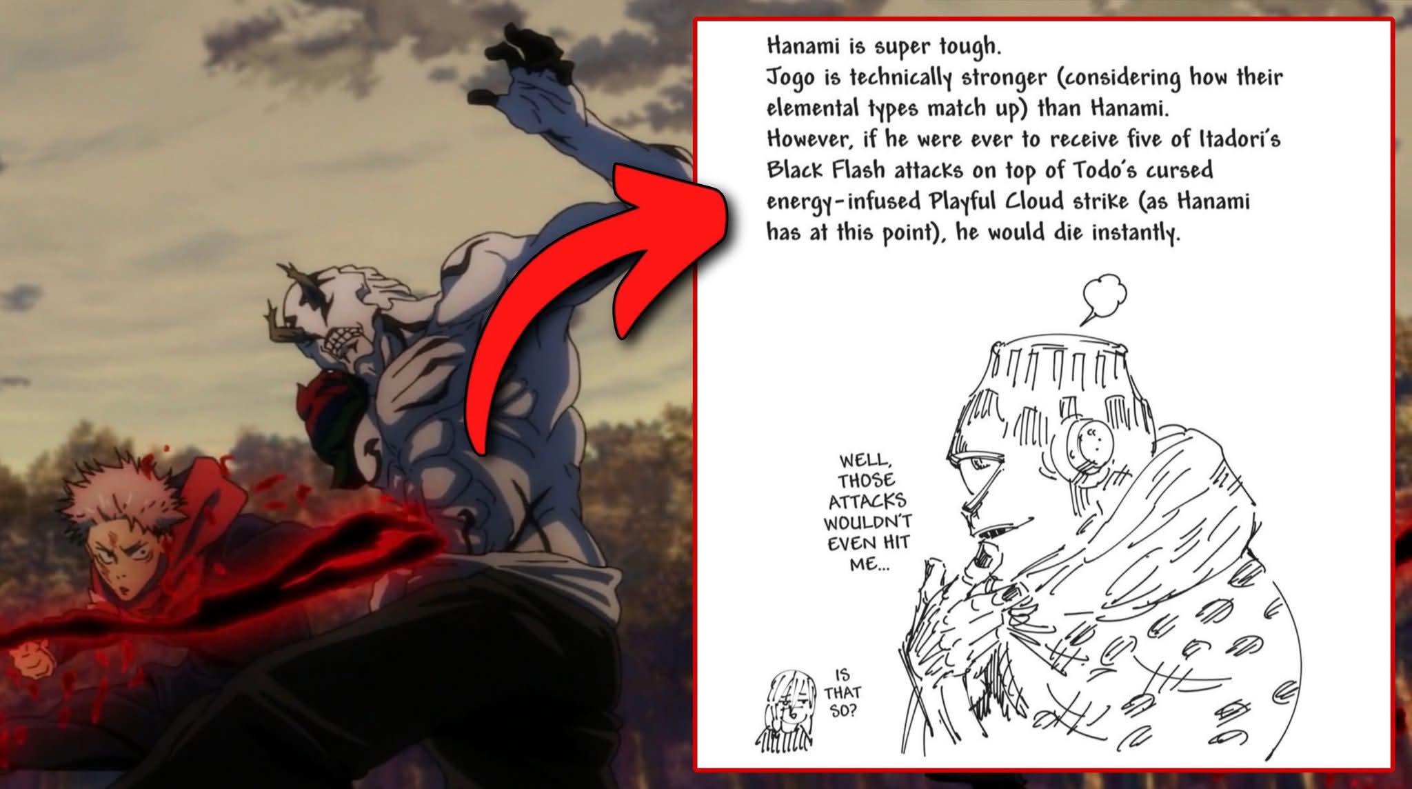 ตามหัวข้อเลย Hanami เป็นคำสาปพิเศษระดับ Special Grade ที่มี ร่างกายแข็งแกร่งทนทาน มาก พวกเขาถือว่ามีพลังคำสาปมหาศาล สามารถใช้เทคนิคได้ต่อเนื่องโดยไม่หมด และเสริมร่างกายด้วยคำสาปเพื่อฟื้นฟูร่างกายได้ทันที เหมือนในมังงะจะมีระบุอยู่มั้งจำไม่ได้แล้ว Gojo ใช้ Hollow Purple โจมตี Hanami หลังจากต่อสู้กับ Yuji และ Todo แล้ว Hanami ยังรอดเกือบตาย, แสดงถึงความแข็งแกร่งขั้นสูง นอกจากนี้ อาจารย์Gege Akutami เองได้กล่าวไว้ว่า “Jogo มีพลังคำสาปมากกว่า แต่ถ้าต้องรับ Black Flash ของ Yuji บวกกับการโจมตีจาก Aoi ในเวลาเดียวกัน Jogo คงตาย ขณะที่ Hanami รอดได้” อาจจะบอกได้ว่าHanami มีทั้งความทนทานและความแข็งแกร่งสูง เมื่อเทียบกับคำสาปพิเศษด้วยกันเอง