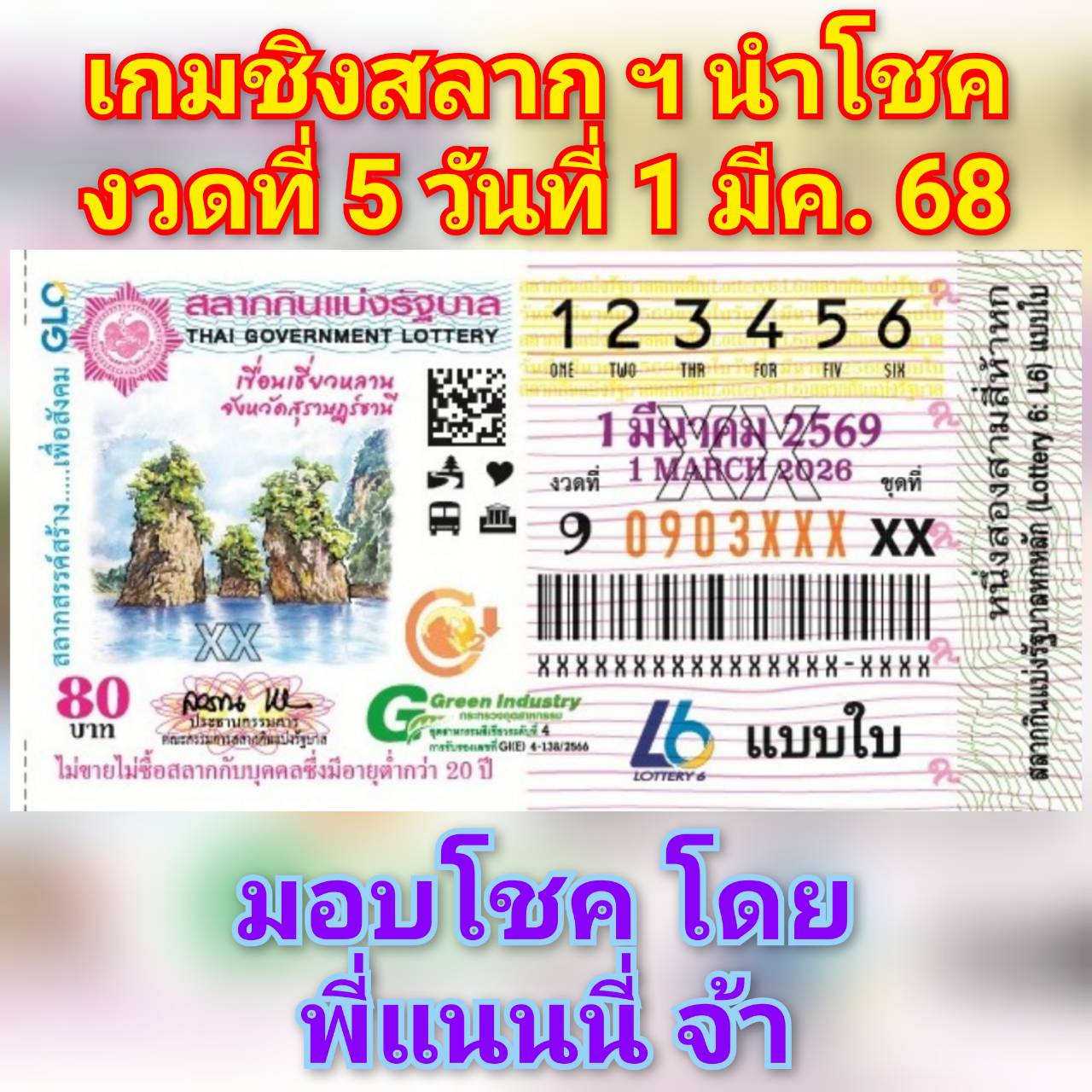 รางวัล :-    สลาก ฯ นำโชค งวดที่ 5 วันที่ 1 มีนาคม 2569  จำนวน 3 รางวัล ๆ ละ 3 ใบ  และ กิตติมศักดิ์ 1 รางวัล คือ น้องบัว ครับ