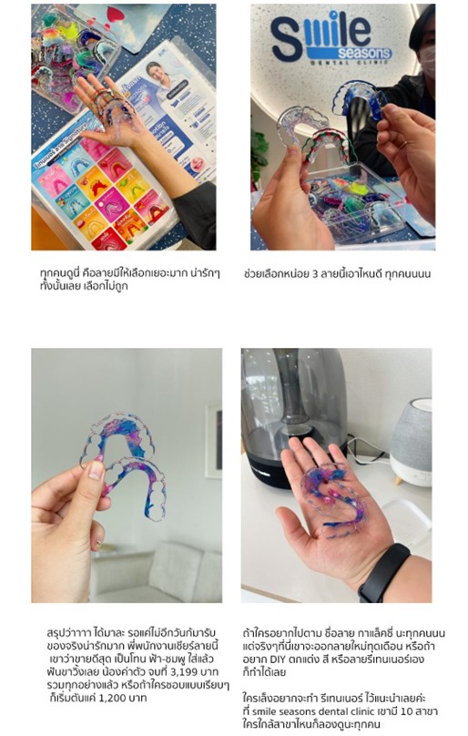 จนไม่รู้ว่าที่ไหน ดีจริงๆ บางครั้งก็ต้องอ่านรีวิวหลายๆที่ถึงจะกล้าไปใช้บริการ ส่วนตัวลองไปคลินิกนี้เพราะว่าไกล้ BTS เดินทางสะดวกด้วย รีวิวก็เริ่ดเลย แล้วที่สำคัญคือเห็นโปรโมชั่นลดเยอะอยู่ เลยลองไปดู ตอนแรกก็ไม่รู้ว่า จะตรงปกตามรีวิวหรือเปล่า แต่อยากเห็นรูปลาย รีเทนเนอร์ของเขาแล้ว น่ารักไม่ไหววว
