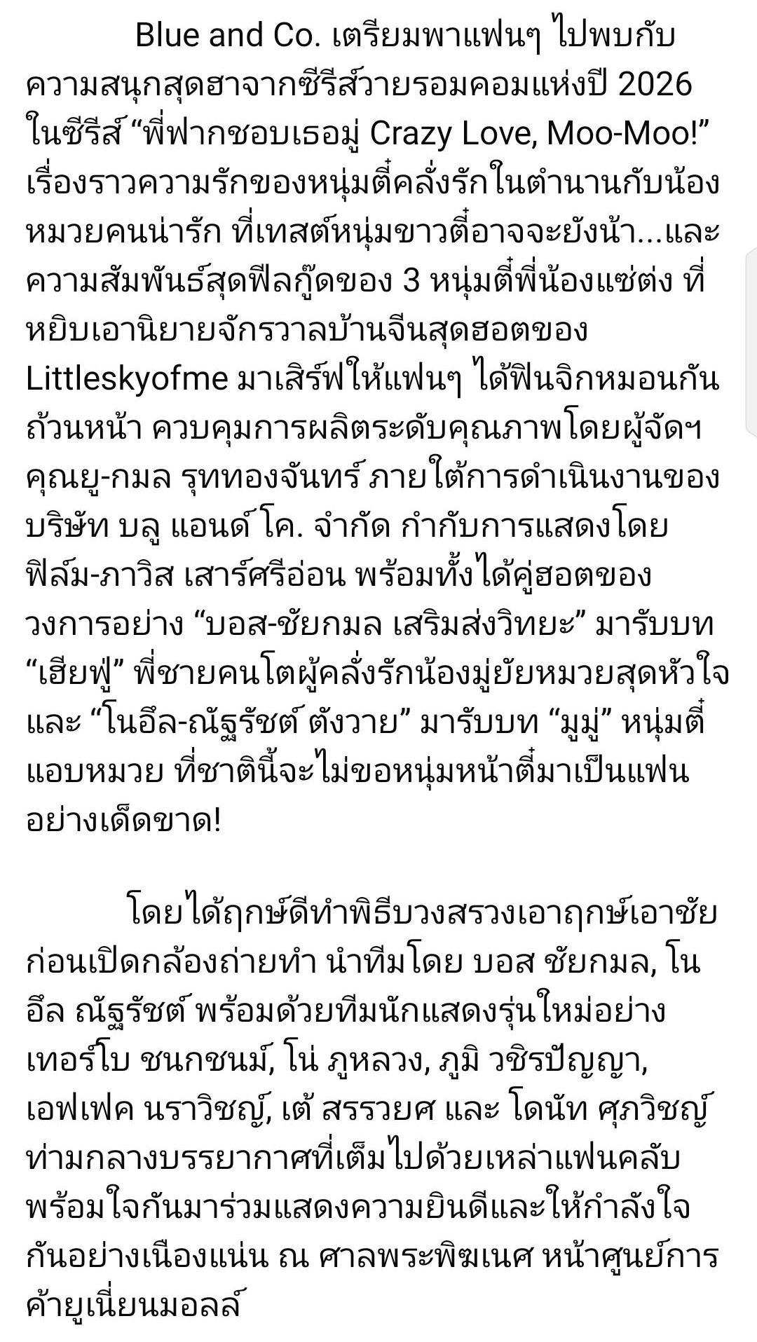 🥳 “บอส–โนอึล” จับมือเปิดจักรวาลบ้านจีน 🙏🎬 บวงสรวง “พี่ฟากชอบเธอมู่ Crazy Love, Moo-Moo!” การันตีฮาฟีลกู๊ด
