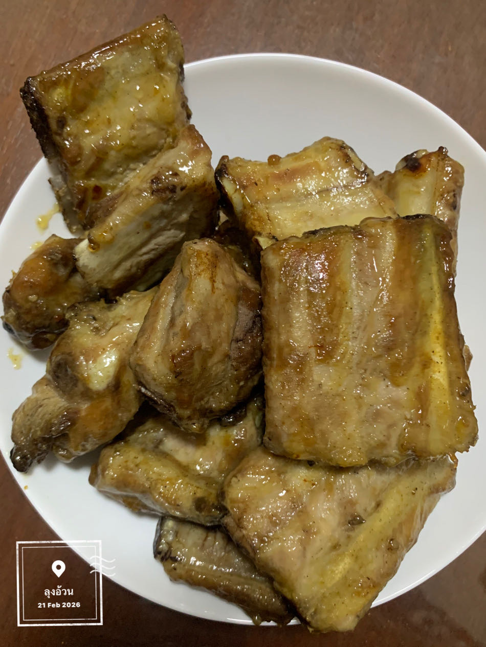 ซี่โครงหมูอบหม้ออบลมร้อน เอามาคลุกน้ำมันหอยร้อยๆในกะทะ