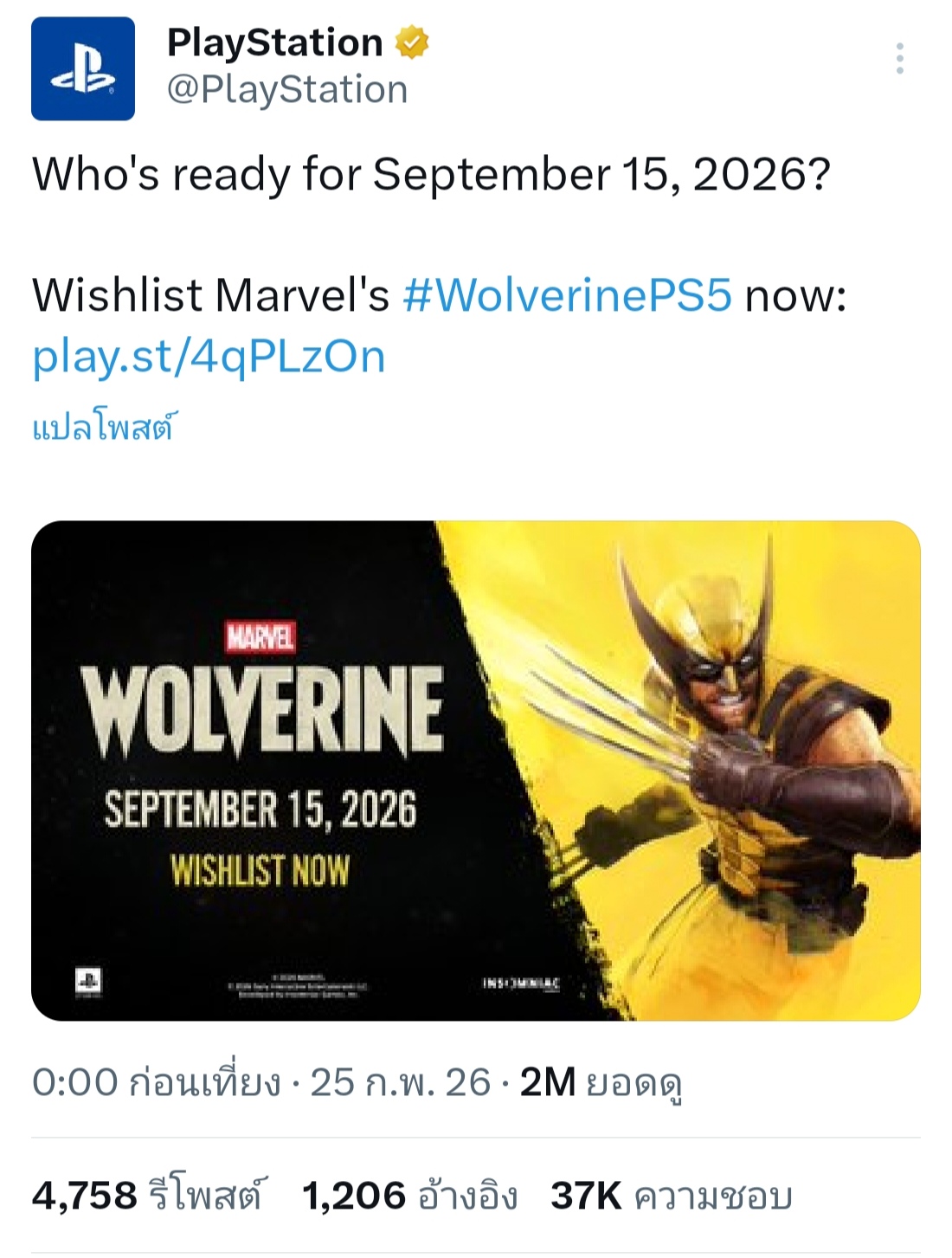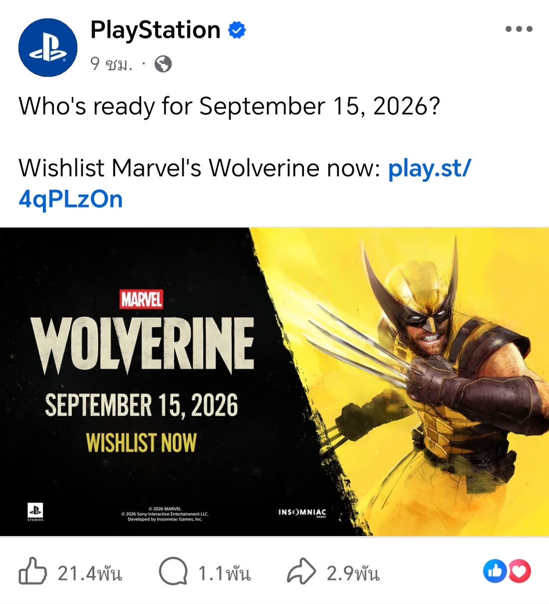 ล่าสุดทาง official playstation ทั้งบน facebook และ X ประกาศวางจำหน่ายเกม MARVEL WOLVERINE อย่างเป็นทางการบน ps5 วันที่ 15 ก.ย. 69 ยังไม่กำหนดราคาแต่ให้กด wishlist รอไว้ได้เลยครับ