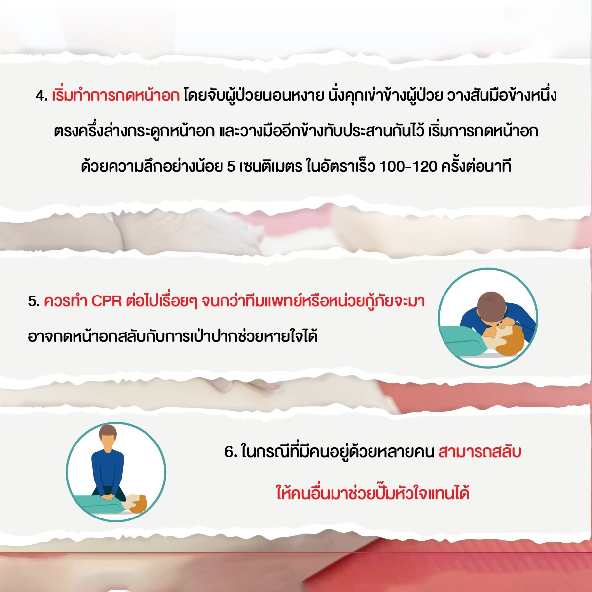 6. ทำต่อเนื่อง อย่าหยุดจนกว่าพี่ๆ กู้ภัยจะมาถึง หรือเครื่อง AED พร้อมใช้งาน