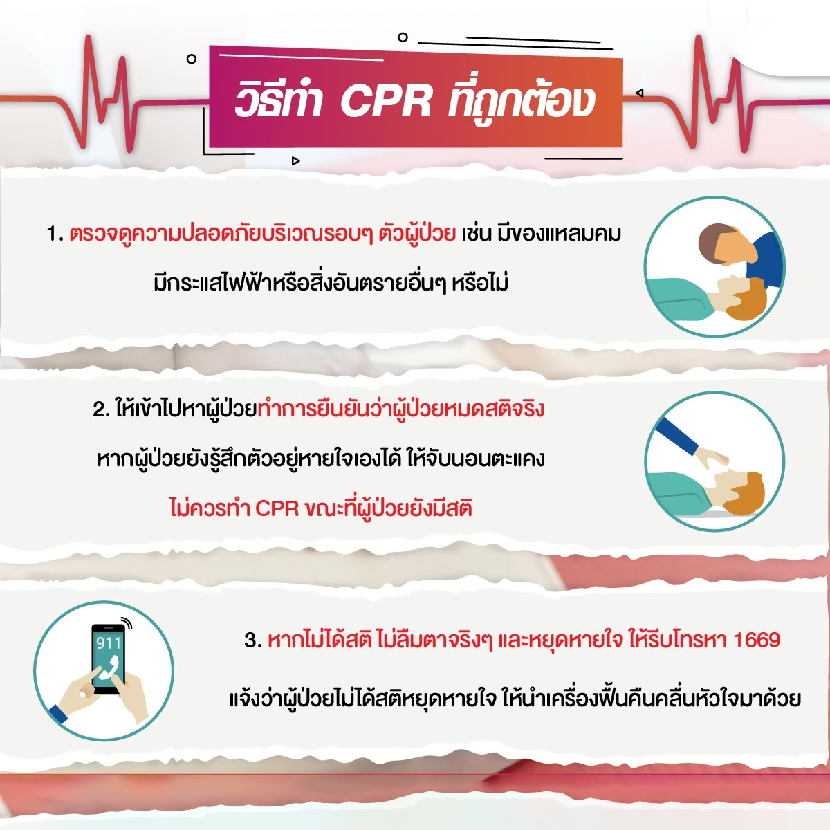 3. โทร 1669 แจ้งว่ามีคนหมดสติ ไม่หายใจ และขอเครื่อง AED ทันที!