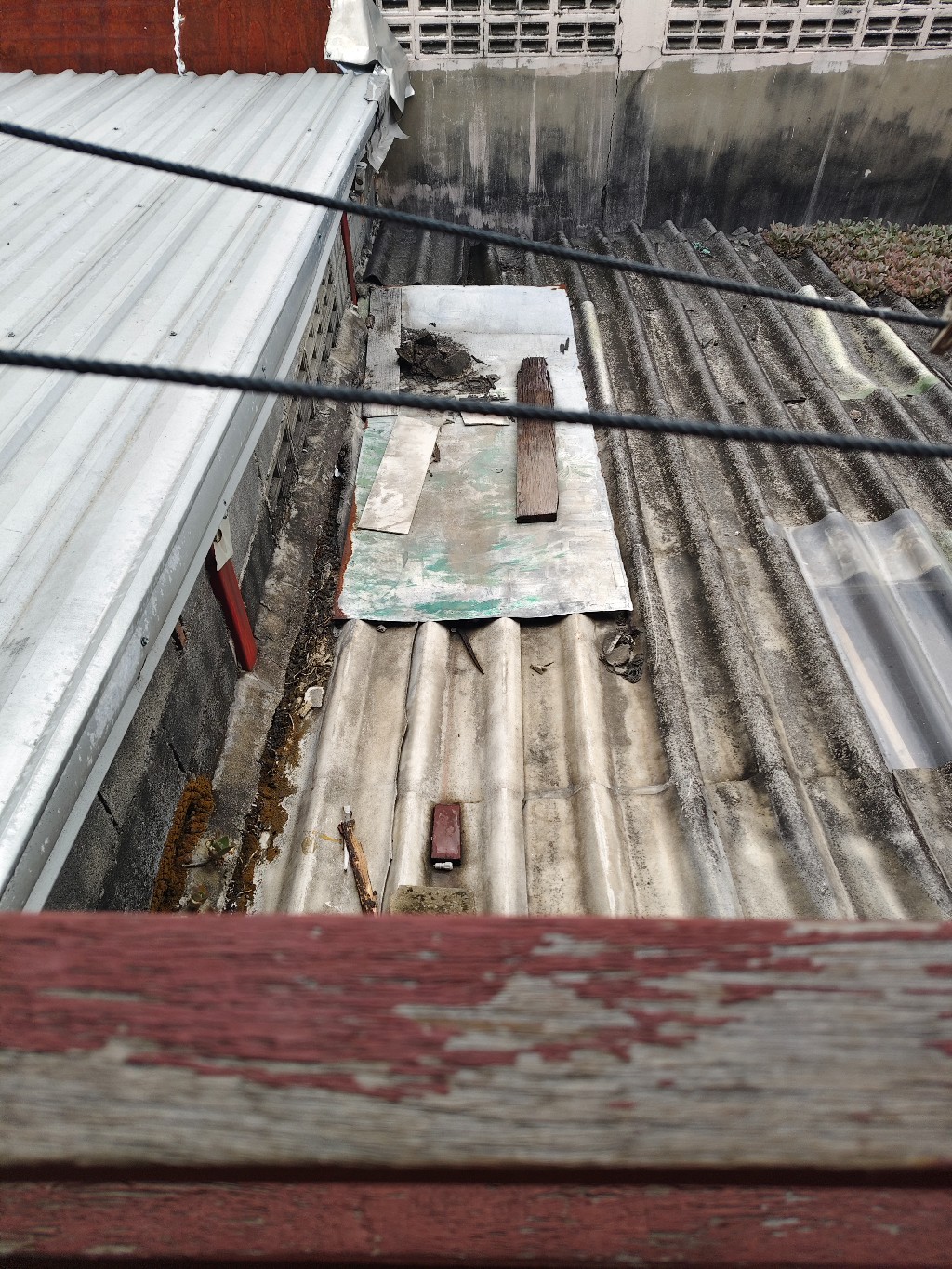 หลังคาบ้านทาน์วเฮ้าส์ เพิ่งจะเปลี่ยนใหม่หมดเมื่อ 4 ปีก่อน ตอนนี้เริ่มจะมีรั่วซึมอีกแล้ว ด้านหน้าเป็นซีแพ็ค ด้านหลังเป็นลอนคู่ ตามช่างคงจะยาก เพราะทำนิดหน่อย ปัญ