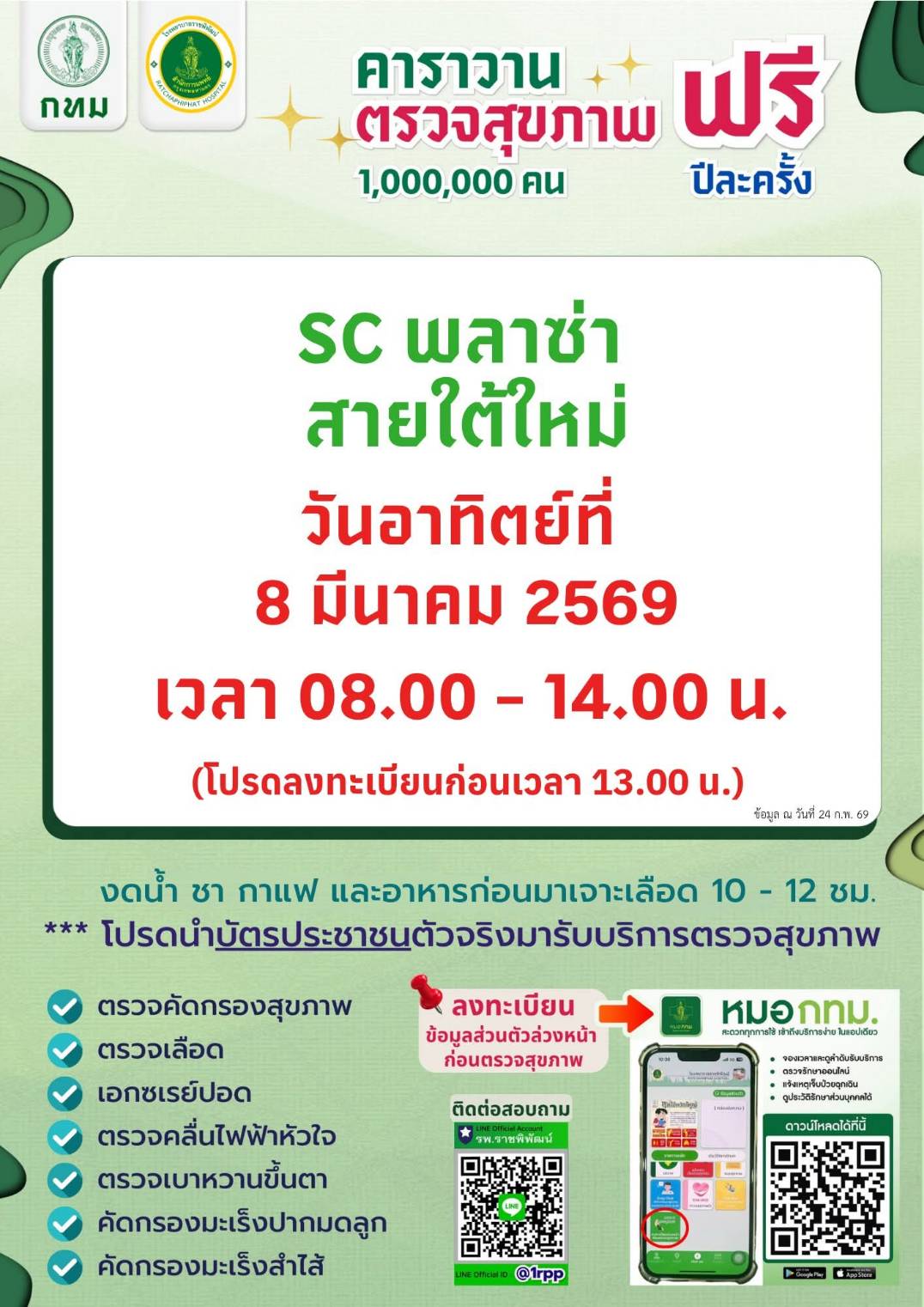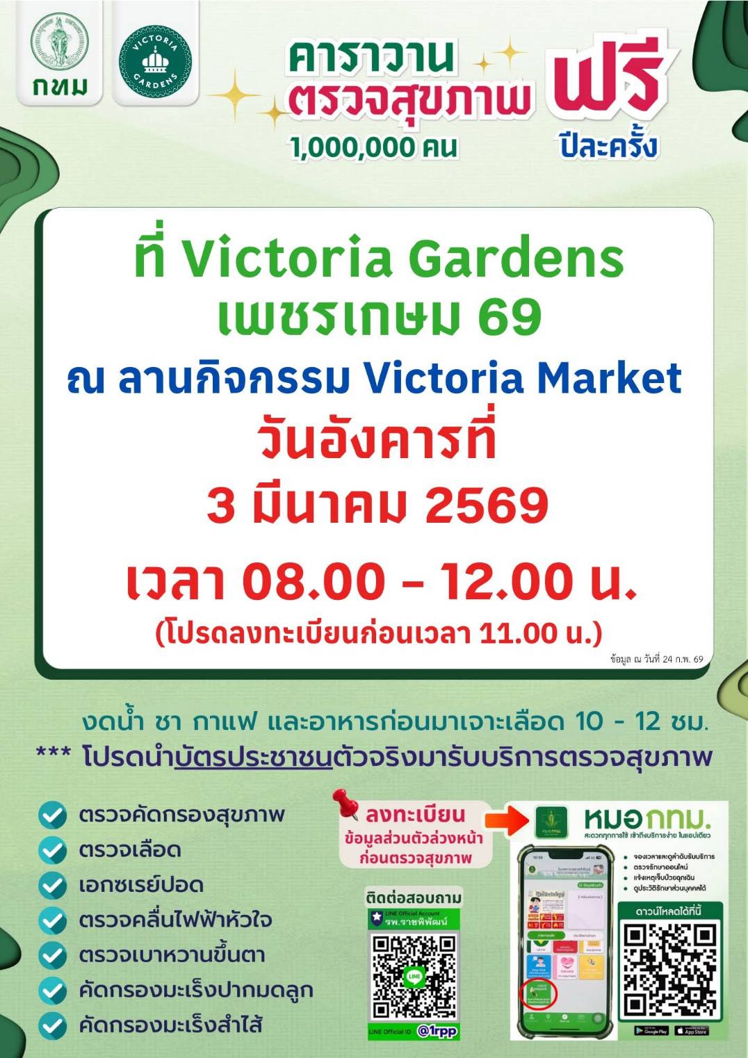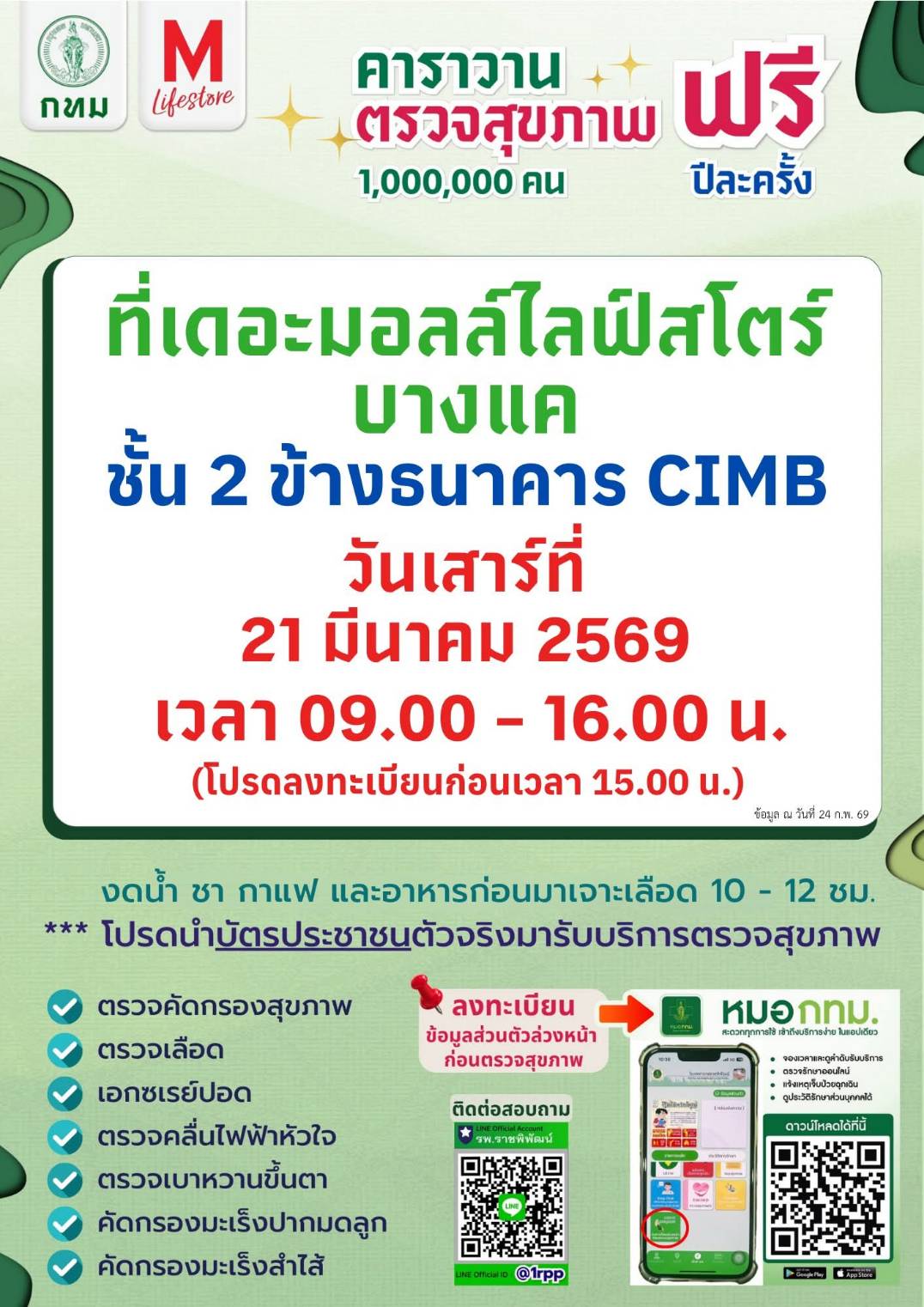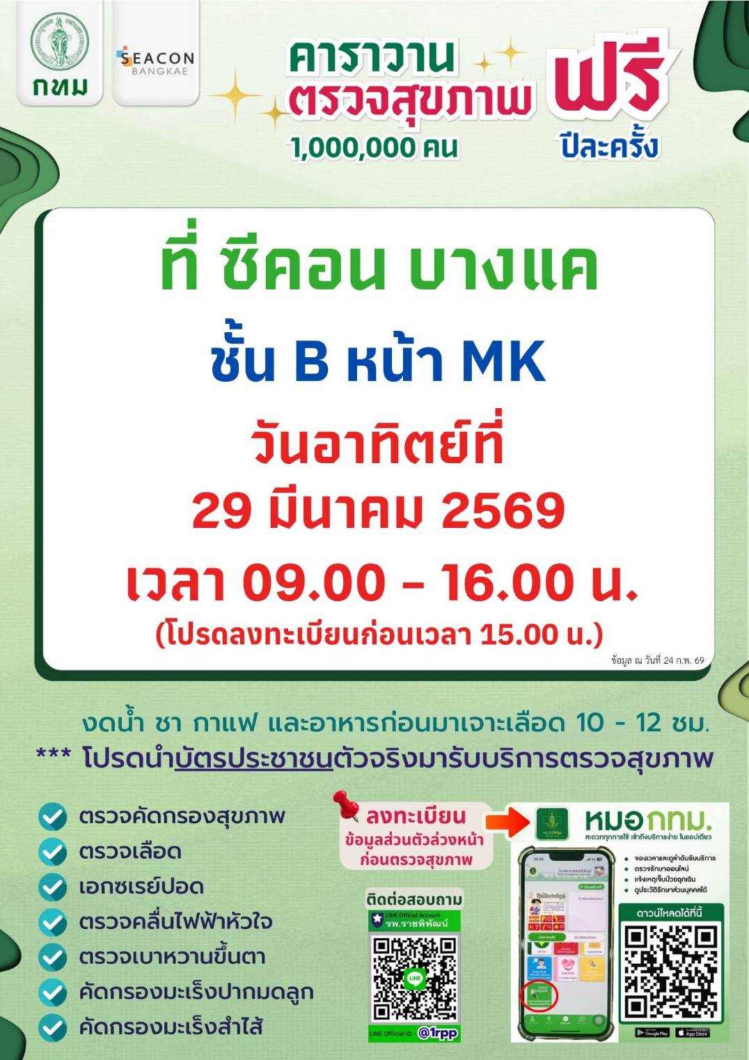 ตรวจสุขภาพฟรีของ กทม. 21กพ.69 ที่เดอะมอลล์บางแค 22กพ. 69 ซีคอนบางแคค่ะ