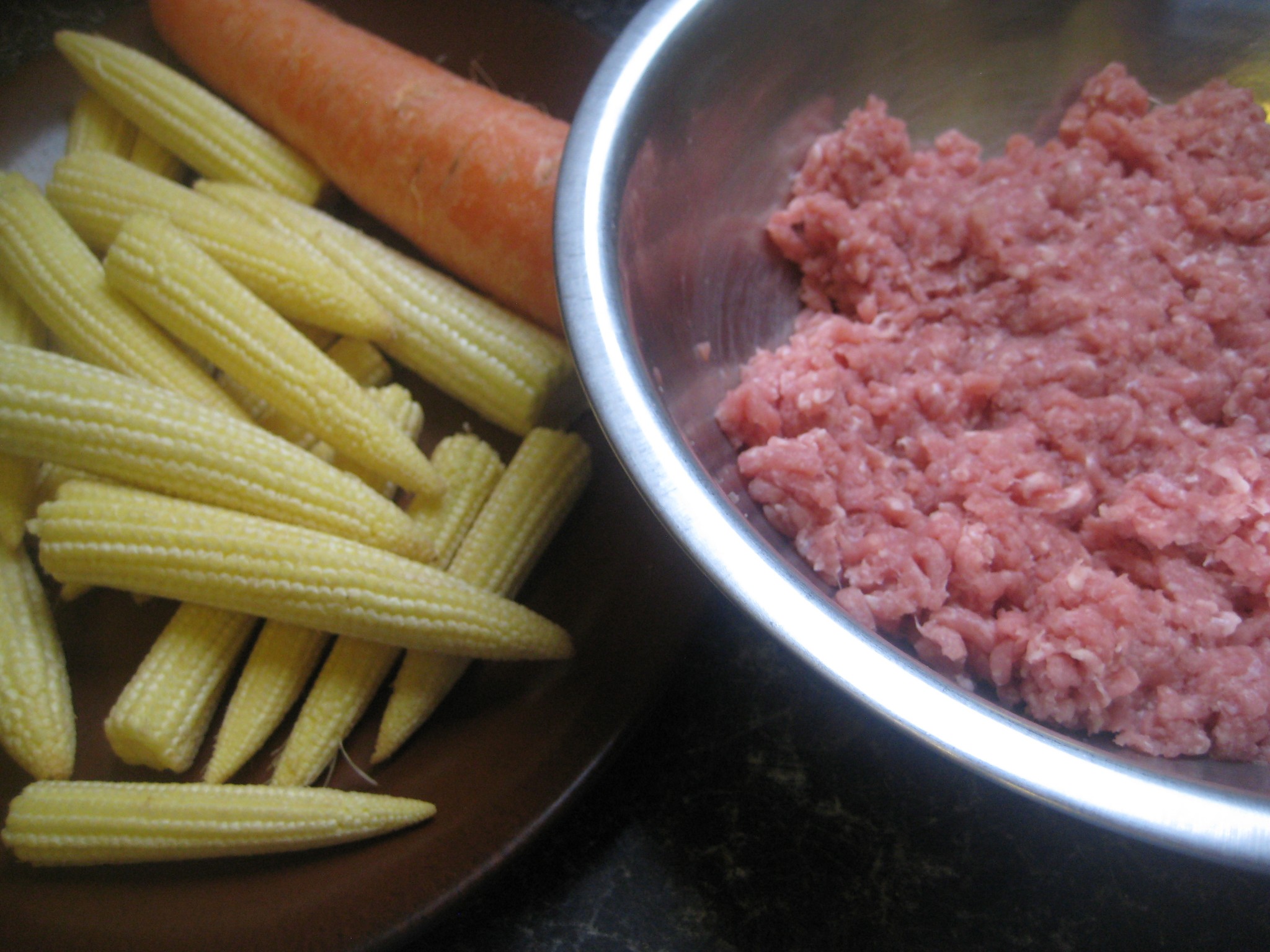 ส่วนผสม หมูบด ข้าวโพดอ่อน แครอท ซีอิ้วขาว ผงปรุงรส น้ำมันหอย น้ำตาลทราย พริกไทยป่น น้ำมันกระเทียมเจียว
