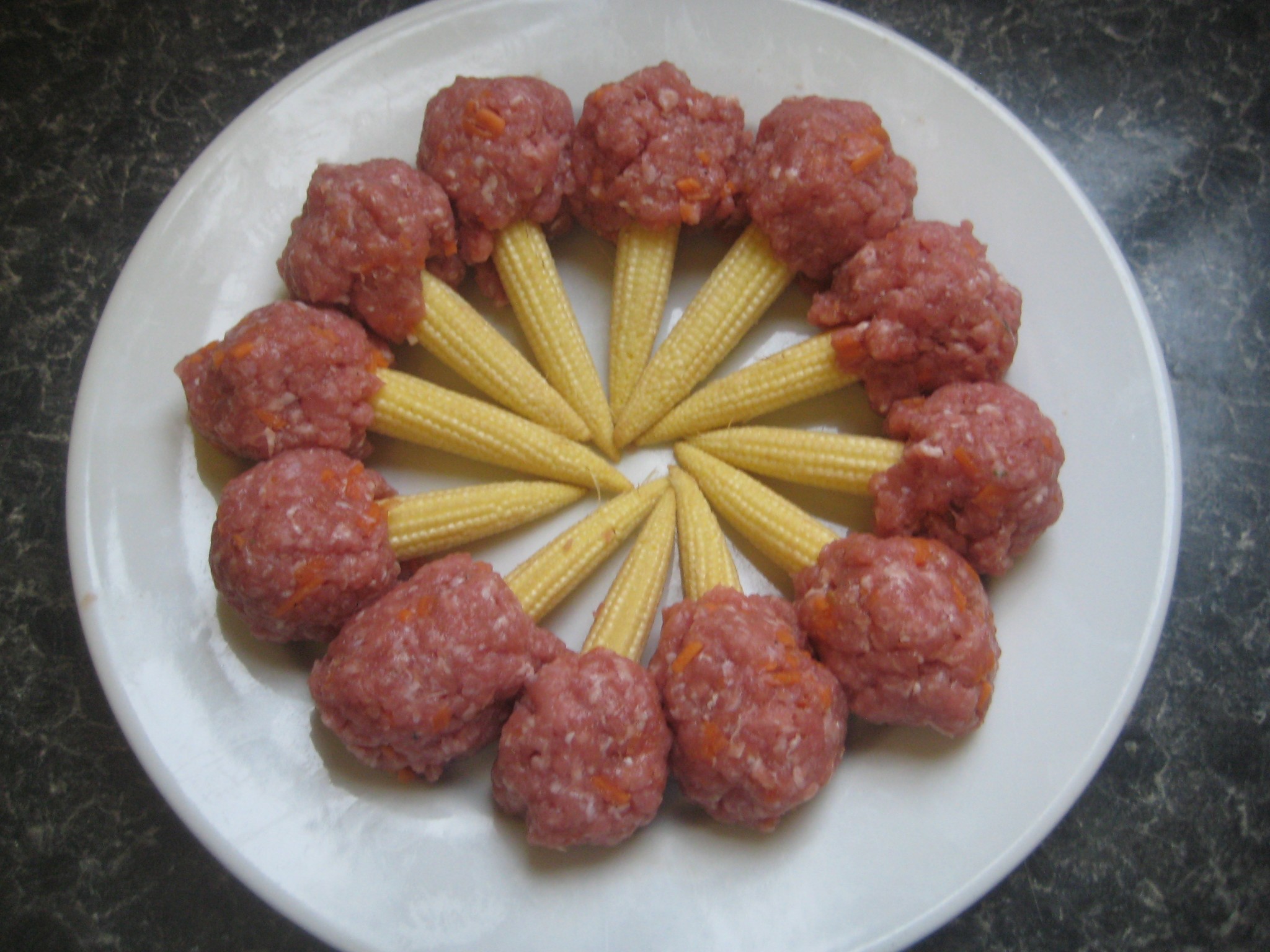 นำส่วนผสมหมูบดมาห่อรอบๆ ข้าวโพดอ่อน จัดเรียงในจาน พร้อมที่จะนำไปนึ่ง
