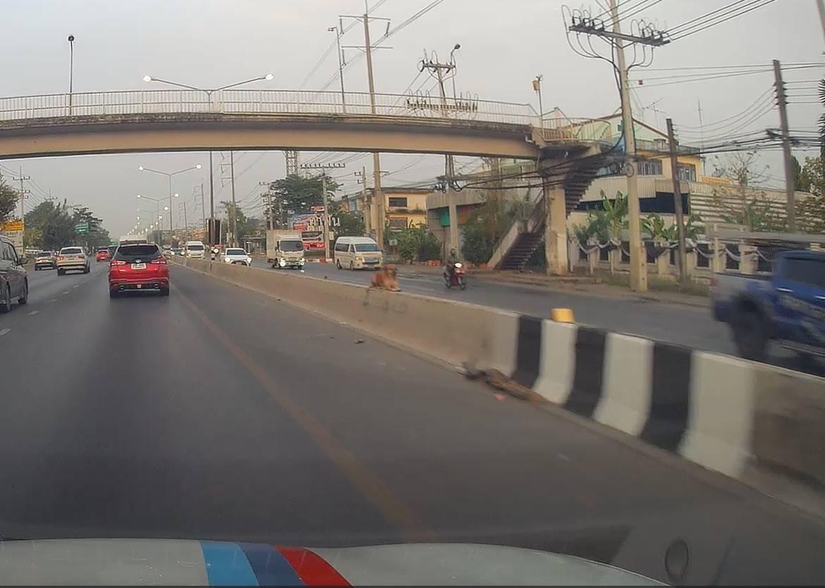 ตกใจ..นึกว่าหุ่น..น้องหมา..นุ่งอยู่บนแผ่นปูนแบ่งช่องทางเดินรถ!