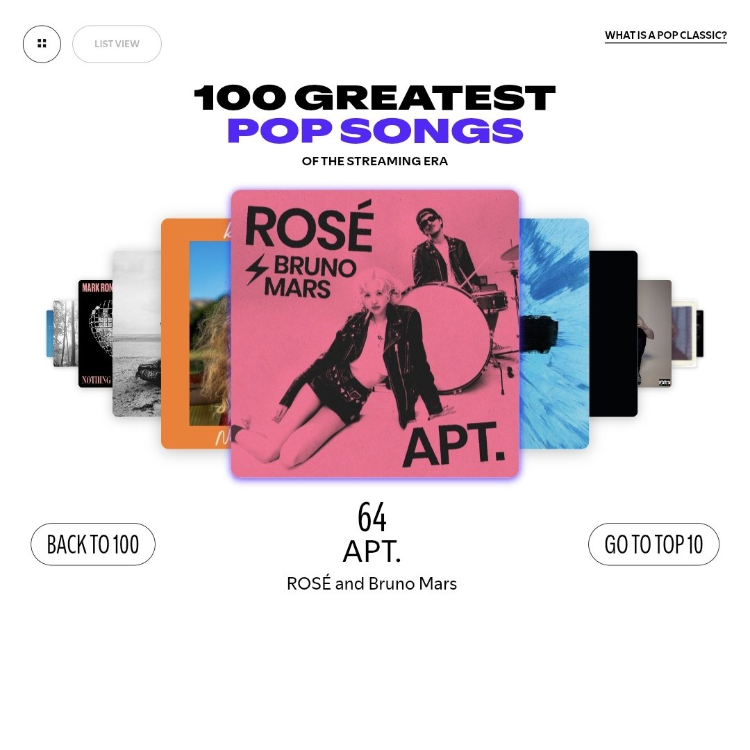 Spotify จัดให้เพลง APT. ของ ROSE เป็นเพลงจากเคป๊อปเพียงเพลงเดียวที่อยู่ใน 100 เพลงที่ยิ่งใหญ่ที่สุดในโลกในยุคสตรีมมิ่ง