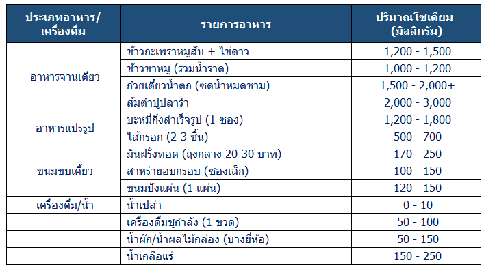 วันนี้ผมเลยรวบรวมข้อมูลมาทำตารางเปรียบเทียบให้เห็นชัดๆ ว่าอาหาร ขนม และเครื่องดื่มที่เรากินกันทุกวัน ซ่อนโซเดียมไว้เท่าไหร่บ้าง