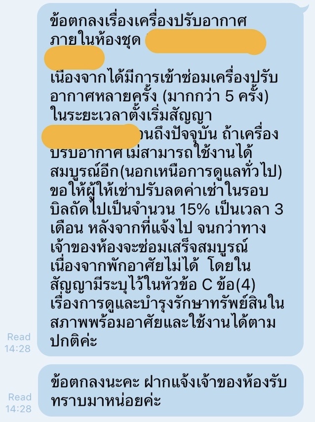 เช่าคอนโด เจ้าของเป็นคนจีน ไม่เคยติดต่อค่ะ ติดต่อผ่านเอเจ้นอย่างเดียว สัญญา 1 ปี อยู่มา 4 เดือน ซ่อมแอร์ตัวเดิม (มีแอร์ 2 ตัว ,1 ตัว มีปัญหาตั้งแต่วันแรก) มากกว่า 5 ครั้ง ซ่อมไม่หายสักที (โดนวางยา,โดนช่างตัดสายไฟบ้าง,ช่างไม่ซ้ำหน้า) โดยที่เอเจ้นไม่เคยเข้ามาติดตามแก้ด้วยตัวเองเลย เพียงแต่เรียกช่างเข้ามา เรานั่งเฝ้าช่าง อยากจบปัญหา ต้องทำยังไงได้บ้างคะ ยื่นข้อตกลงขอลดค่าเช่าแล้ว เอเจ้นตอบกลับมาว่า “เจ้าของก็บอกว่าเสียเงินซ่อมไปเยอะแล้ว ค่าเช่าถูกแล้ว” เราเสนอเอาช่างที่เราไว้ใจเข้าซ่อมแล้วก็ไม่ยอมรับราคา (ในสัญญาระบุว่าผู้ให้เช่าจะรับผิดชอบเรื่องดูแลแอร์ค่ะ ) แนะนำหน่อยค่ะ