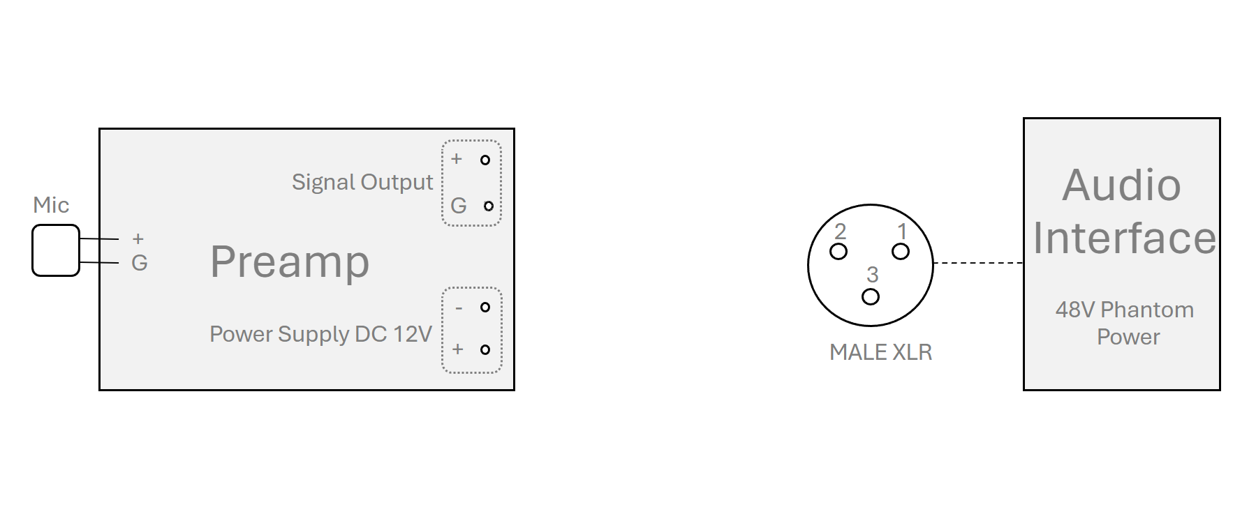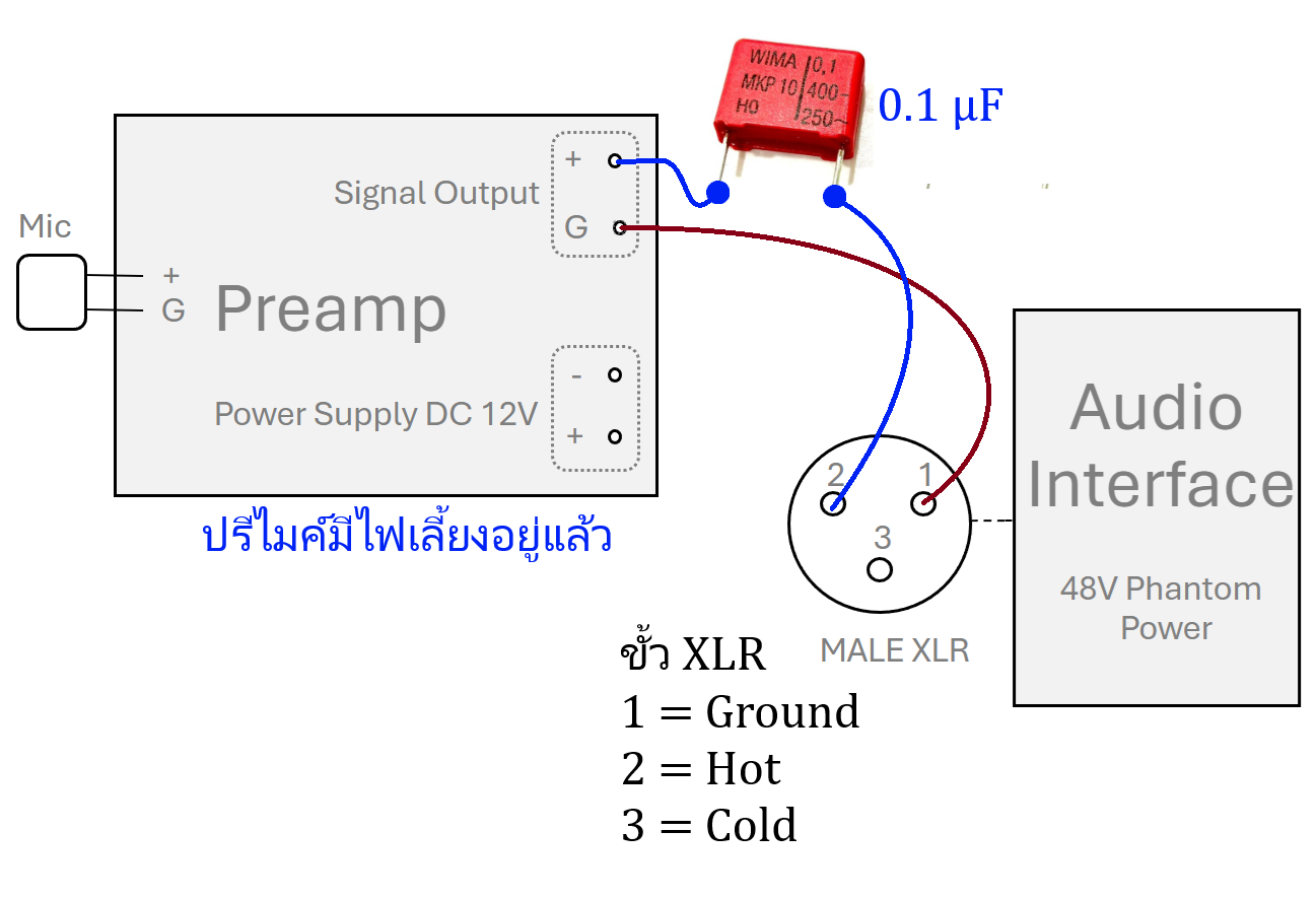 ก็คือตัวปรีไมโครโฟนมีไฟเลี้ยงอยู่แล้ว ดังนั้นส่วน Phantom Power 48V จึงไม่เกี่ยวข้องด้วย เชื่อมต่อด้วยสายสีน้ำเงินกับน้ำตาลแค่นั้น โดยมี Capacitor 0.1 μF คั่นเพื่อ block ไฟตรง