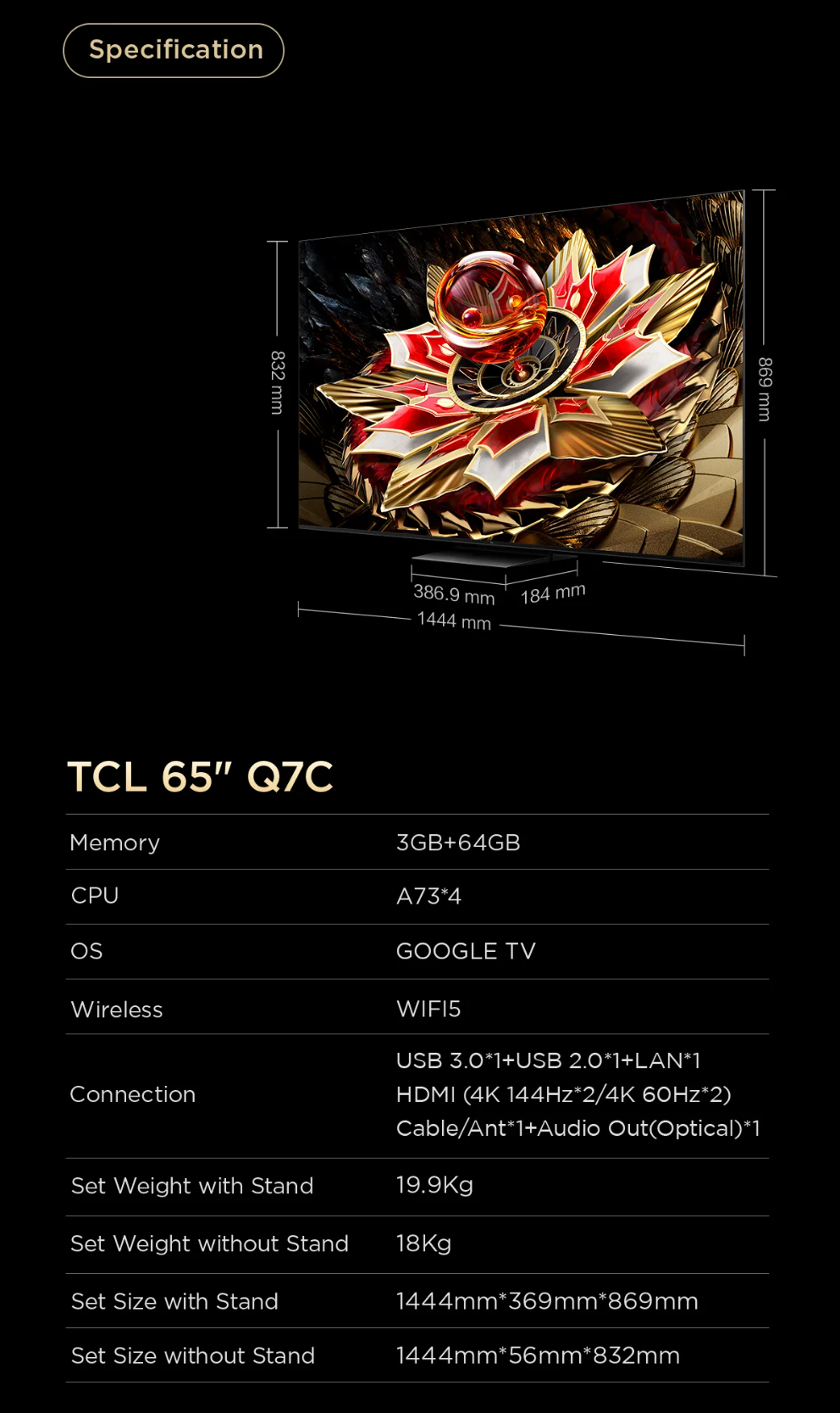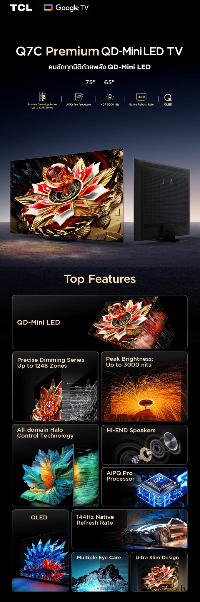 TCL ทีวี 65 นิ้ว 4K Mini QLED Google TV รุ่น 65Q7C HVA Panel ระบบปฏิบัติการ Google/Gaming TV/IMAX Enhanced