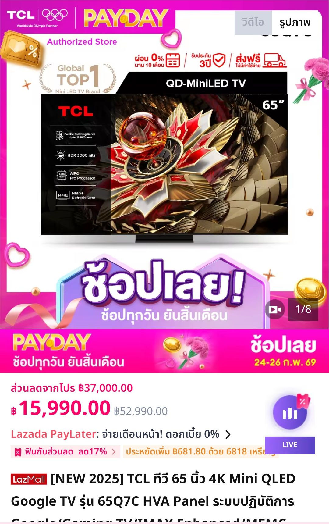 ราคา TV ช่วง PAYDAY ช็อปเลย! ช้อปทุกวัน ยันสิ้นเดือน 24-26 ก.พ.69 QD MiniLED TV ทีวี 65 นิ้ว รุ่นรอง Top