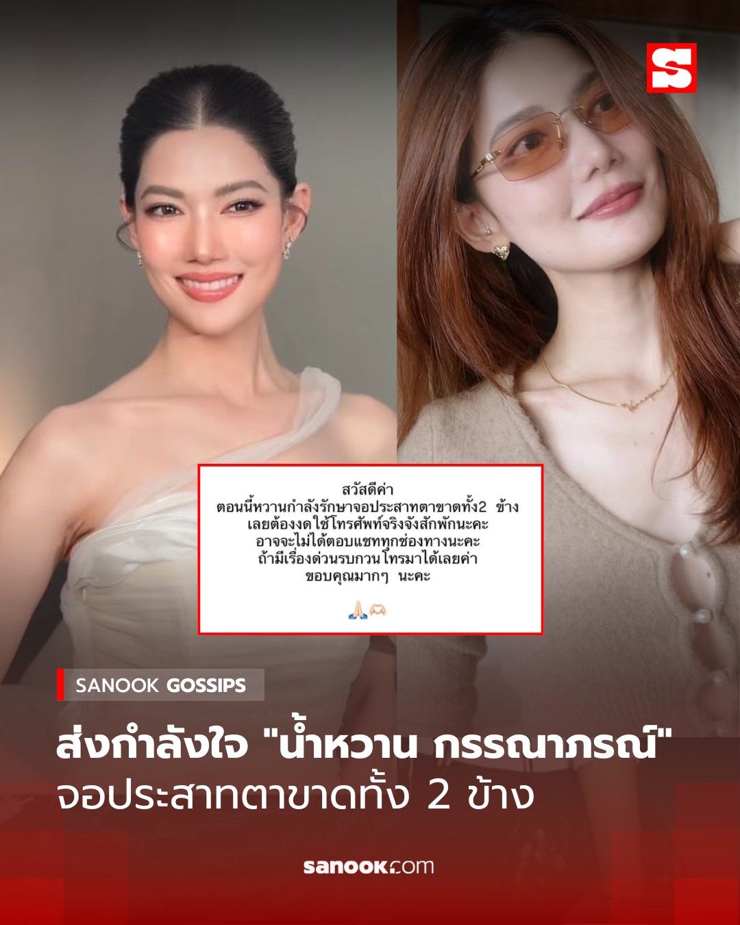 ทำเอาแฟน ๆ ตกใจไม่น้อย หลังเจ้าตัวออกมาแจ้งข่าวว่ากำลังรักษาอาการ "จอประสาทตาขาดทั้ง 2 ข้าง" และจำเป็นต้องพักการใช้โทรศัพท์ รวมถึงขอพักโซเชียลอย่างจริงจังเพื่อโฟกัสกับการรักษาตัว