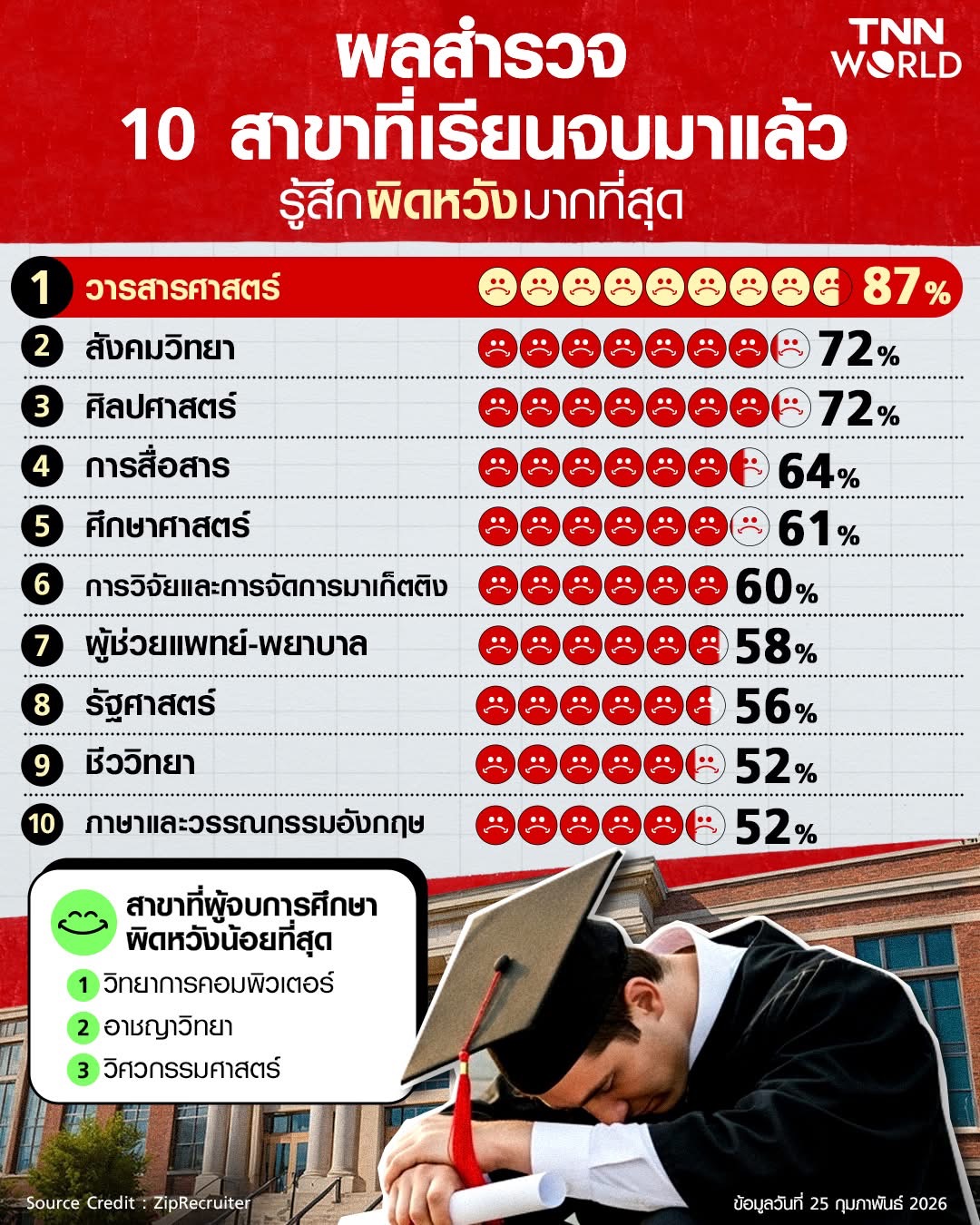 จากผลสำรวจล่าสุดของ ZipRecruiter เมื่อปี 2022 พบว่า 44% ของเด็กจบใหม่ในปัจจุบัน รู้สึกเสียใจที่เลือกเรียนสาขานี้ในมหาวิทยาลัย ส่วนบัณฑิตที่มีความสุขที่สุดกับสาขาที่จบมาคือ ผู้ที่จบสาขาวิทยาการคอมพิวเตอร์และสารสนเทศ และสาขาอาชญาวิทยา ในสองกลุ่มนี้ 72% จะเลือกเรียนสาขาเดิมอีกครั้งหากต้องเลือกในวันนี้