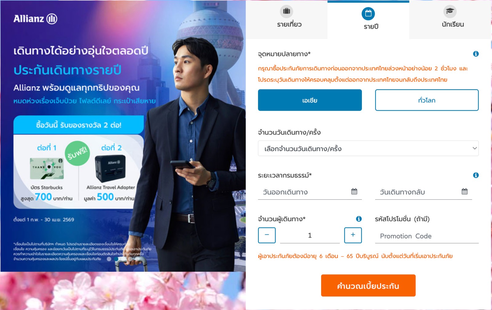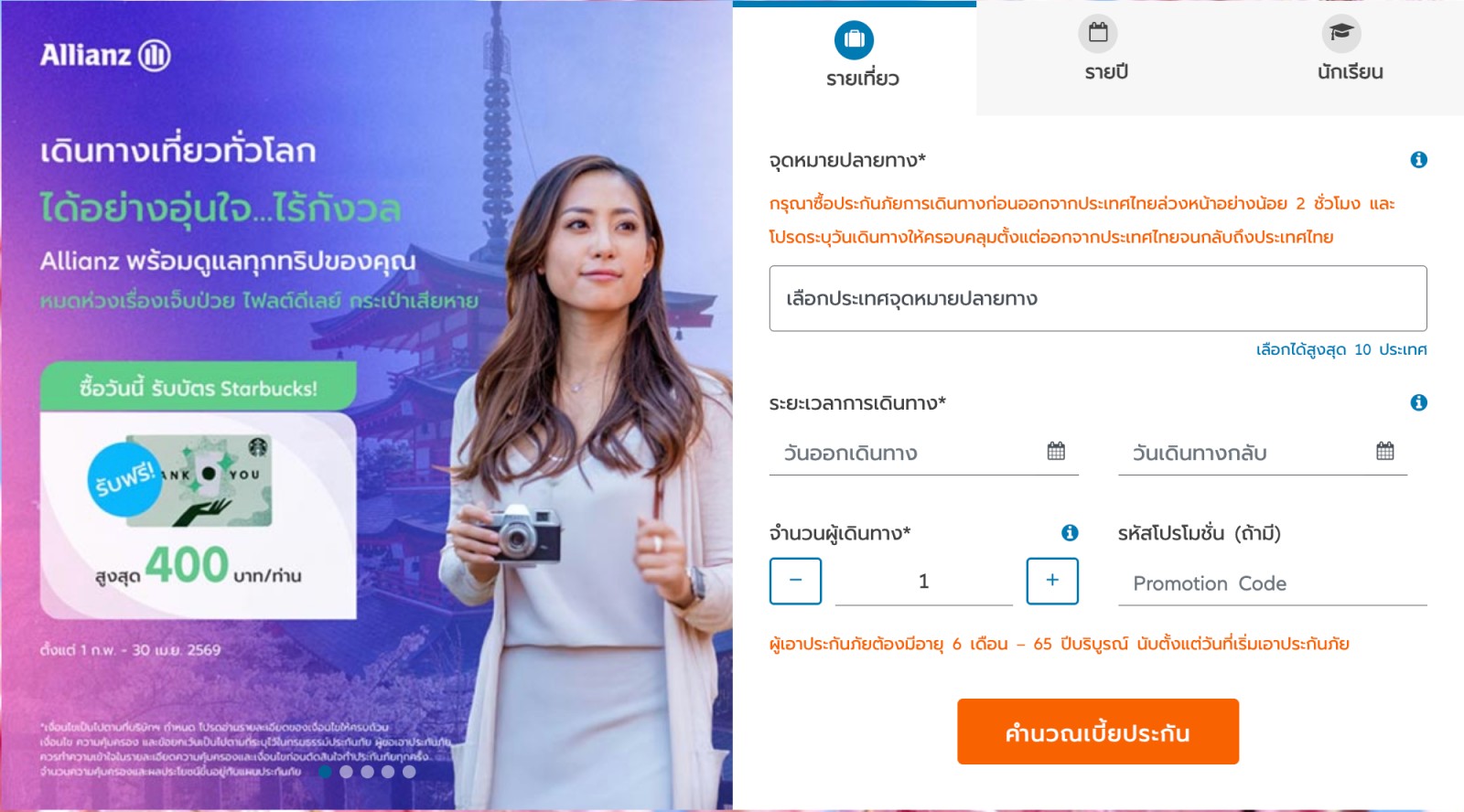 ซื้อประกันเดินทางแผนรายปี ตั้งแต่ 5,000 บาทขึ้นไป รับฟรี! บัตร Starbucks มูลค่าสูงสุด 700 บาท และ Allianz Travel Adapter มูลค่า 500 บาท รวมมูลค่าของรางวัลที่ได้รับสูงสุด 1,200 บาท