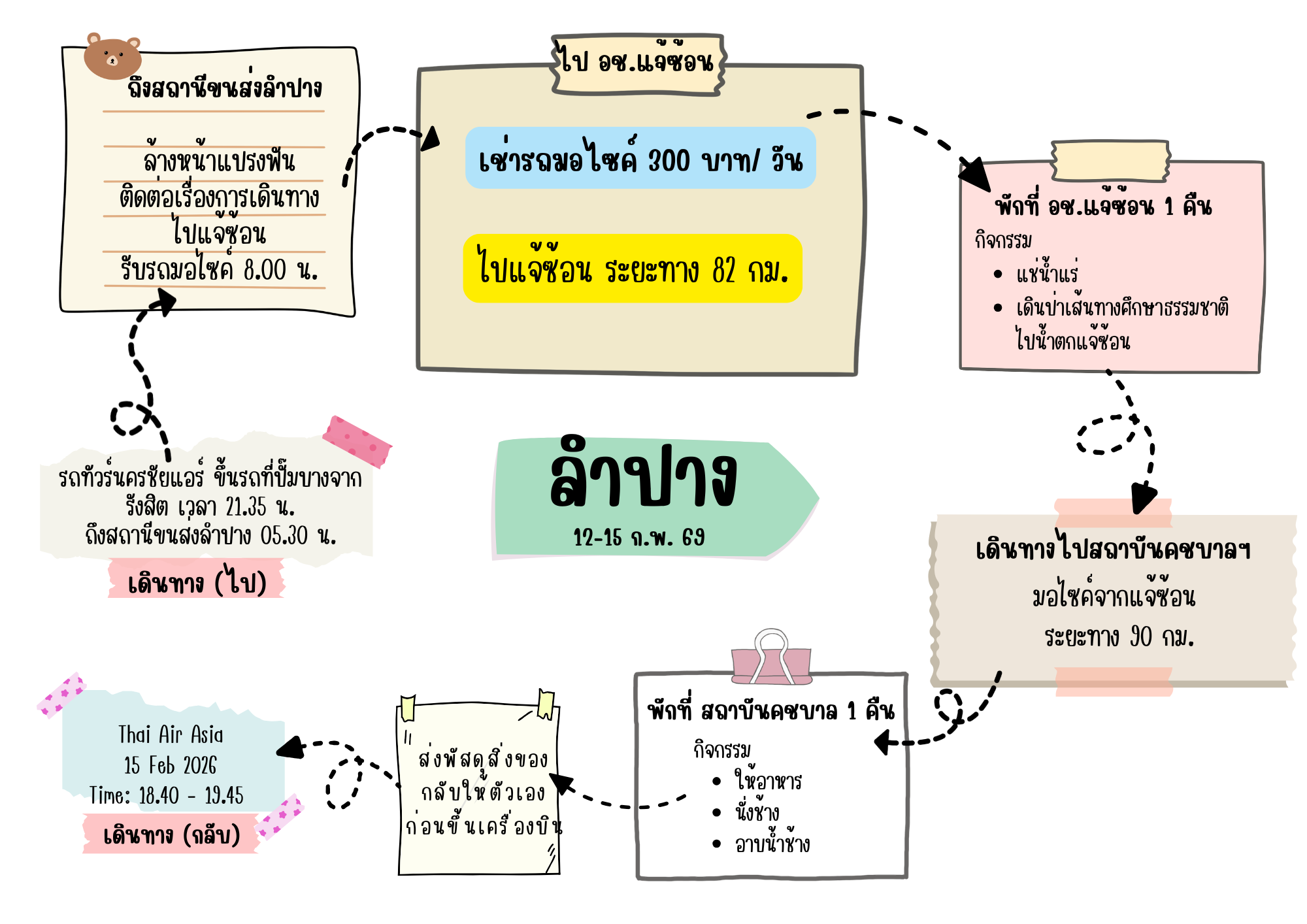 วันนี้เราอยากจะมาแชร์ทริป "ลำปาง" แบบชาวออฟฟิศที่มีวันลาน้อย เป็นทริปย้อนวัยกับเพื่อนสนิทสมัยมัธยมปลายที่รู้ไส้รู้พุงกันมานาน เพื่อนเราเป็นคุณเพื่อนสายเดินป่า มาเจอคุณนายสายเดินวัด เลยพบกันครึ่งทาง ลุย 60% ชิล 40% เราขอเพื่อนเติมช้างให้เราด้วย ส่วนคุณเพื่อนขอนอนแช่น้ำแร่ ทริปนี้คุณเพื่อนสายป่า จัดการให้หมด เราเป็นผู้ตามอย่างเดียว เราสรุปทริปแบบสั้นๆ ได้ตามนี้