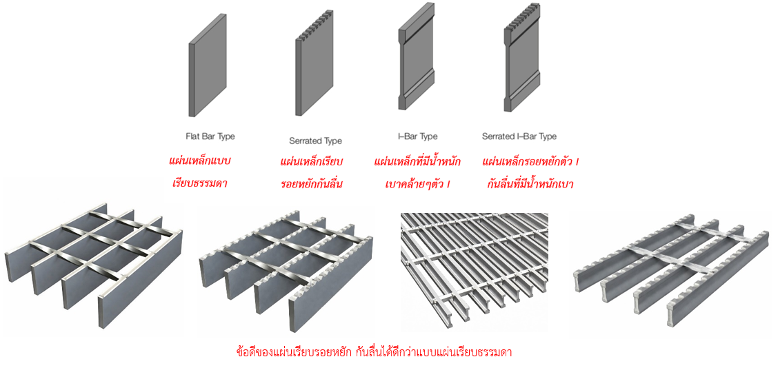 4. ติดตั้งง่าย: มีหลายขนาดสำเร็จรูป และสามารถสั่งผลิตได้ตามความเหมาะสมของงาน หลากหลายรูปแบบ: มีทั้งผิวเรียบและแบบหยัก เพื่อป้องกันการลื่นไถล