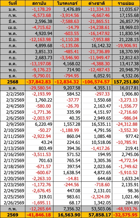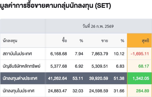 Sinthorn Summary : 26/2/2569 : ต่างชาติซื้อสุทธิ 1,342.05 ลบ.