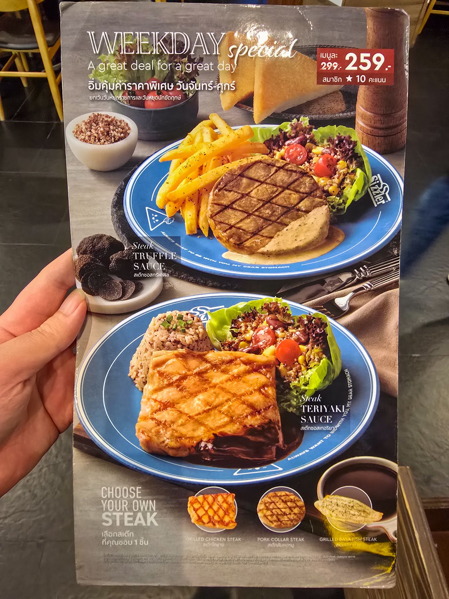 ปกติผมเป็นสาย Healthy ที่ชอบแวะไปทาน Salad Bar ที่ Sizzler เป็นประจำอยู่แล้ว แต่วันนี้พอดีมีโอกาสไปทำธุระแถว Central Salaya ช่วงวันธรรมดา เลยถือโอกาสไปลองใช้โปรโมชั่นที่เล็งไว้ซักหน่อย ปรากฏว่าพอลองคำนวณส่วนลดแบบ Step-by-Step แล้ว เฮ้ย! มันคุ้มจนต้องขออนุญาตมาตั้งกระทู้แชร์ต่อ เผื่อจะเป็นประโยชน์กับเพื่อนๆ ที่อยากกินของอร่อยในราคาสบายกระเป๋าครับ