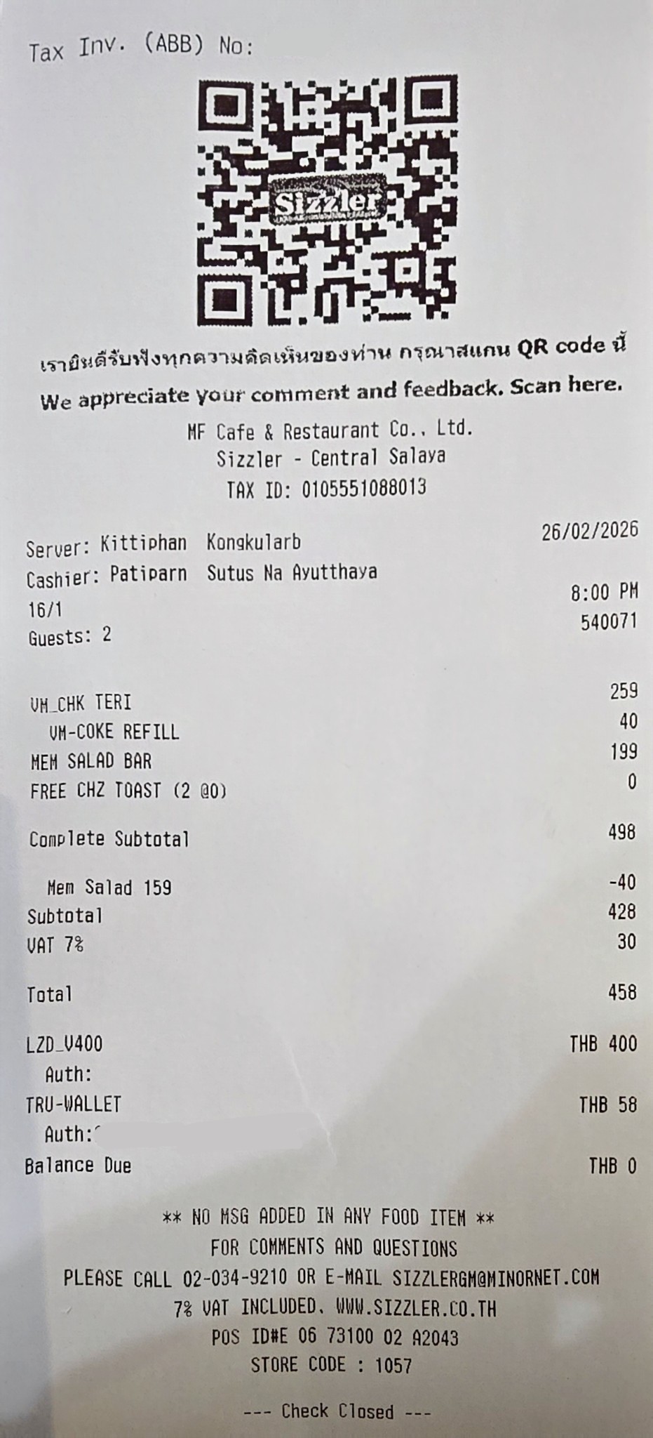 สรุปคือ: ผมได้ทานสเต็กไก่ 1 จาน + น้ำรีฟิล 1 แก้ว + สลัดบาร์ 2 คน ในราคาที่ "ถูกกว่า" เดินเข้าไปสั่งสลัดบาร์ราคาปกติคนละ 199 บาทเสียอีกครับ (ประหยัดไปได้หลายสิบบาท แถมได้อิ่มสเต็กด้วย)