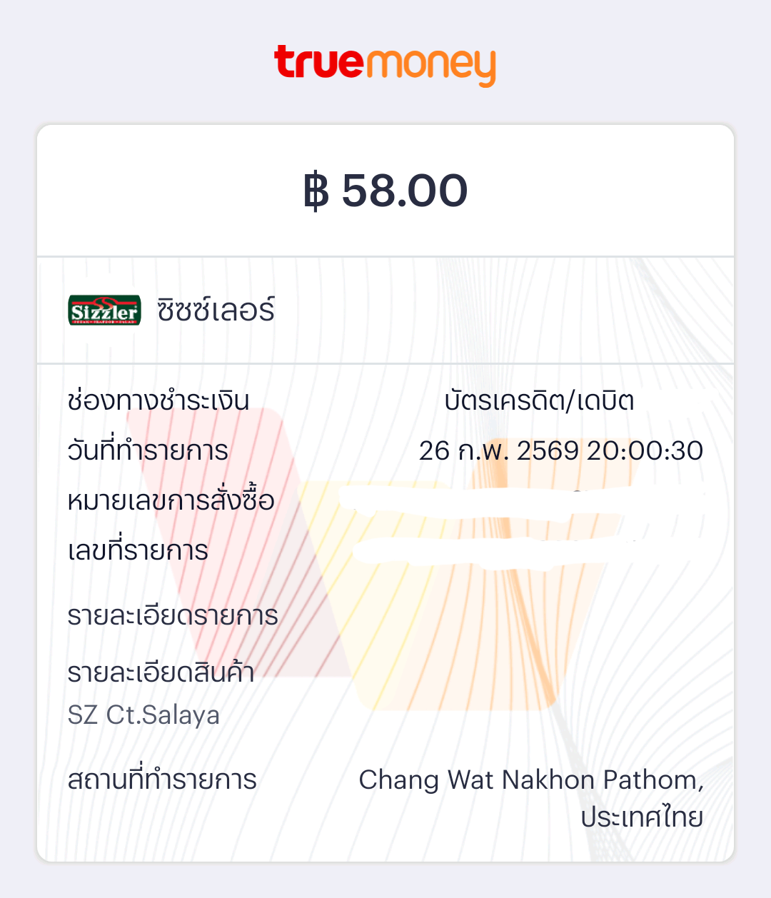ต่อที่ 3 (TrueMoney Wallet): ยอดส่วนต่างหน้าร้านอีก 58 บาท ผมจ่ายผ่าน TrueMoney ที่ผูกบัตร UOB PREFERRED ใบเดิม ได้ Cash Back คืนอีก 15% (ประมาณ 8.7 บาท)