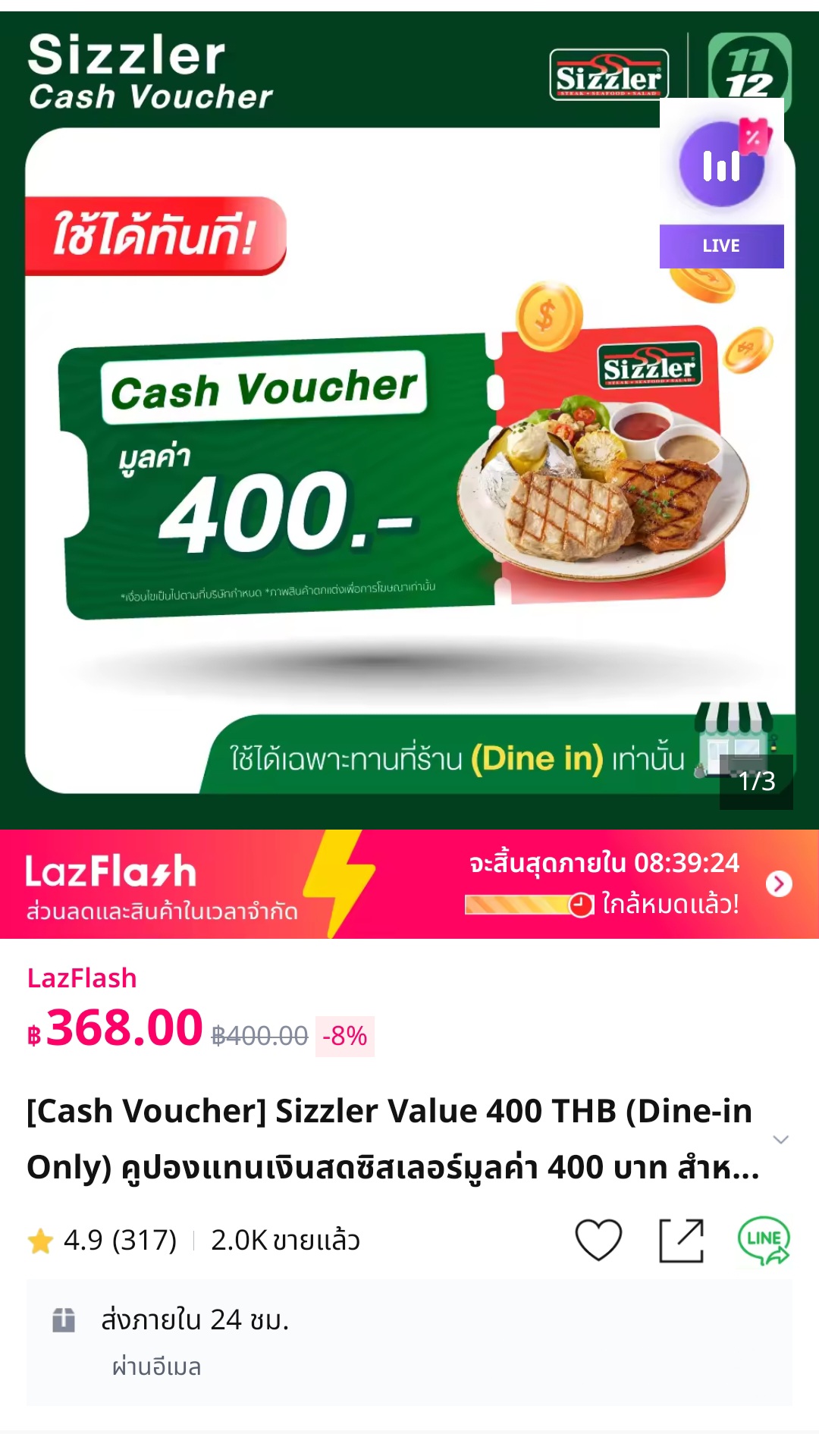 ต่อที่ 1 (Lazada Flash Sale): ผมซื้อคูปองเงินสด Sizzler มูลค่า 400 บาท มาในราคา 368 บาท (ลดไป 8%)