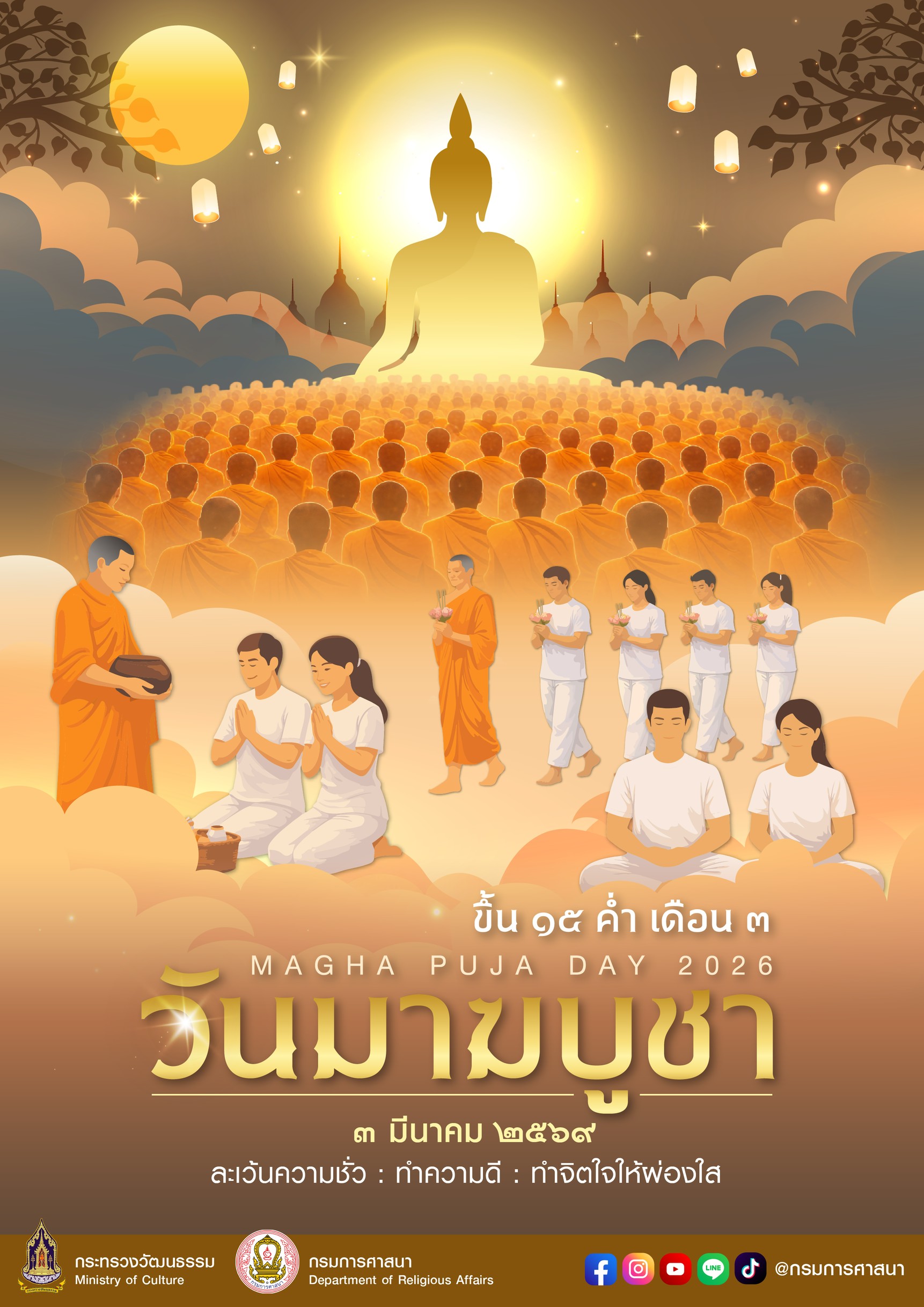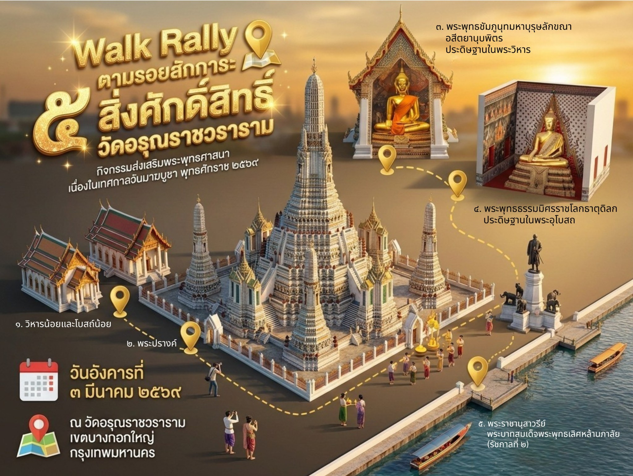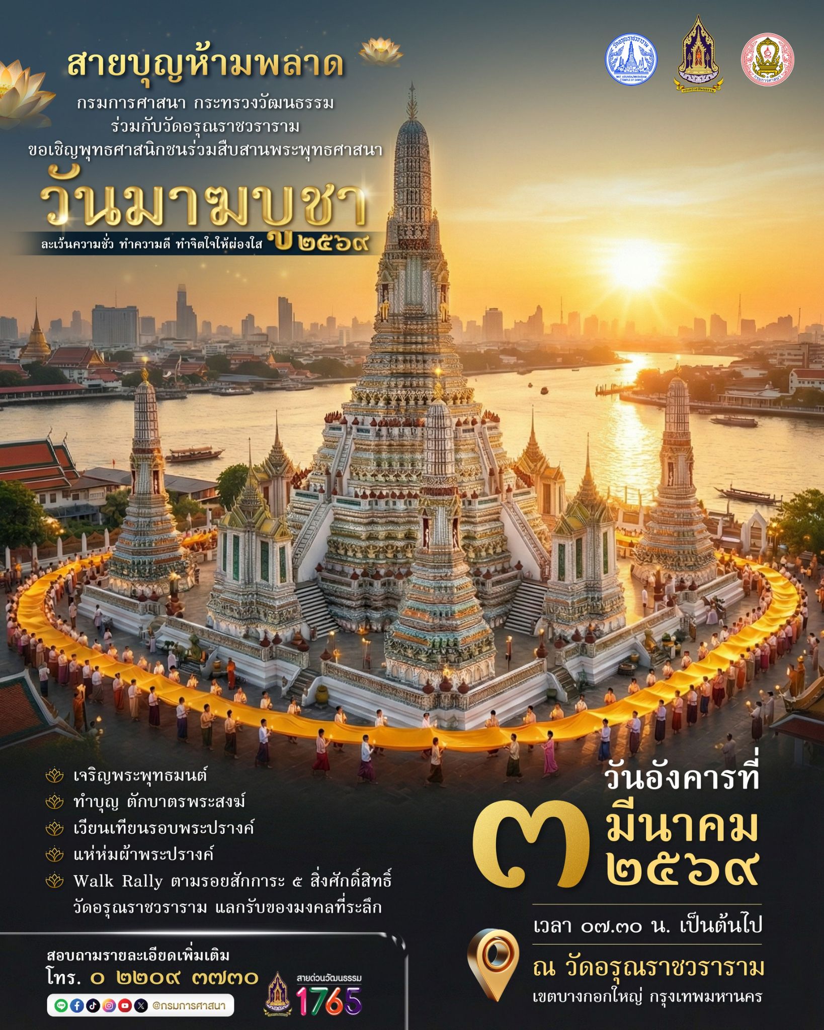 กระทรวงวัฒนธรรม โดยกรมการศาสนา เตรียมจัดกิจกรรมใหญ่เนื่องในเทศกาลวันมาฆบูชา ประจำปี 2569 เชิญชวนพุทธศาสนิกชนแต่งกายชุดไทย ร่วมสวดมนต์ ฟังเทศน์ ทำบุญ ตักบาตร เวียนเทียน ห่มผ้าพระปรางค์ พร้อมจัดกิจกรรม Walk Rally ตามรอยสักการะ 5 สิ่งศักดิ์สิทธิ์ ณ วัดอรุณราชวราราม ในวันที่ 3 มีนาคมนี้ เพื่อเปิดโอกาสให้พุทธศาสนิกชนและประชาชนทั่วไปได้ร่วมกันสืบสานพระพุทธศาสนา เสริมสร้างคุณธรรมจริยธรรม และความเป็นสิริมงคลแก่ตนเอง สังคม และประเทศชาติ
