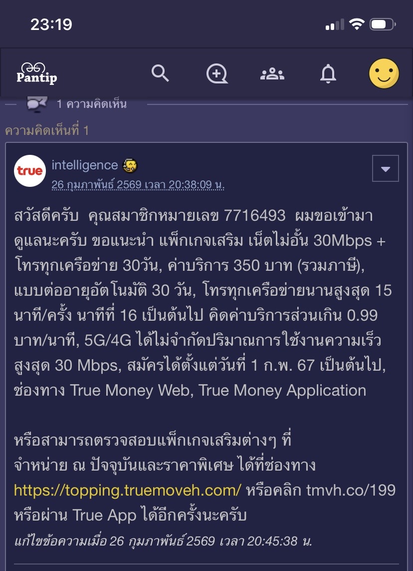 นาที/ครั้ง นาทีที่ 16 เป็นต้นไป คิดค่าบริการส่วนเกิน 0.99บาท/นาที, 5G/4G ได้ไม่จำกัดปริมาณการใช้งานความเร็ว สูงสุด 30 Mbps, สมัครได้ตั้งแต่วันที่ 1 ก.พ. 67 เป็นต้นไป, ช่องทาง True Money Web, True Money Application