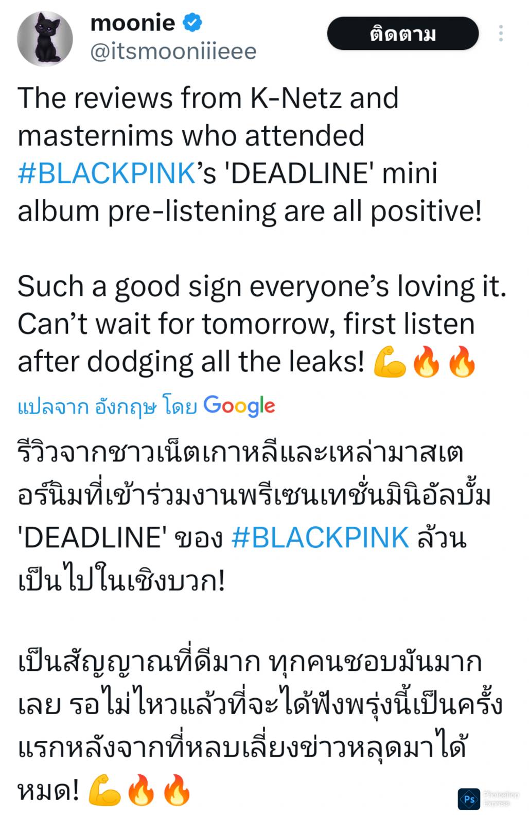 เสียงตอบรับ เสียงชื่นชมกระหึ่มจาก K Netizen ทั้งหลายที่ได้รับเชิญให้เข้าฟัง Pre Listening อัลบั้ม DEADLINE ของ BLACKPINK ในวันนี้ ทุกเสียง