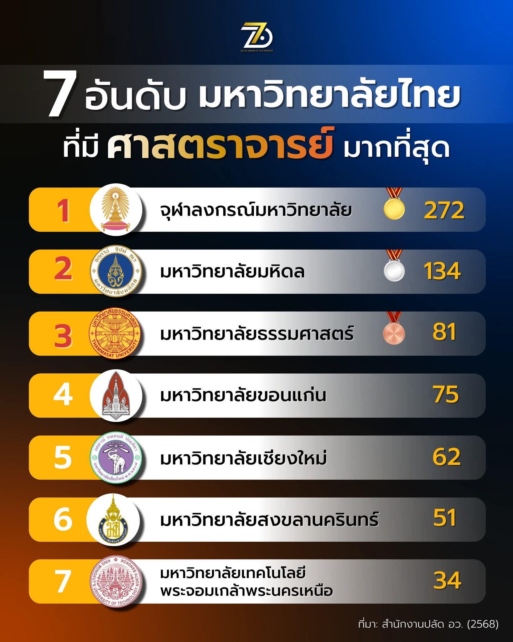 📊 7 อันดับมหาวิทยาลัยที่มีจำนวน “ศาสตราจารย์” มากที่สุดในประเทศไทย