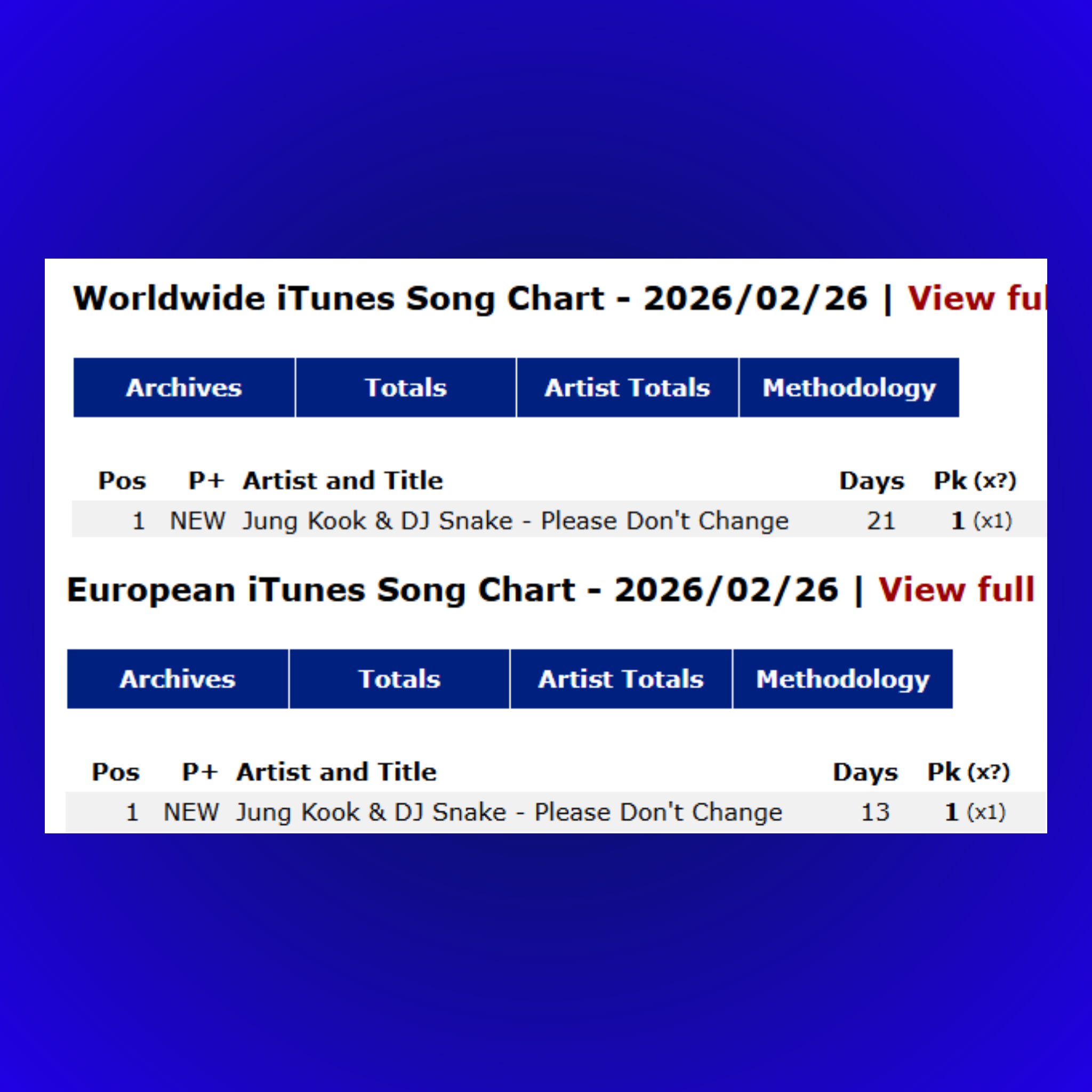เพลง 'Please Don’t Change' ของจองกุก กลายเป็นเพลงแรกของศิลปินเอเชียที่สามารถขึ้นครองอันดับ 1 บนชาร์ต iTunes ทั้งในระดับโลก (Worldwide) และระดับยุโรป (European) ได้พร้อมกันในปี 2026