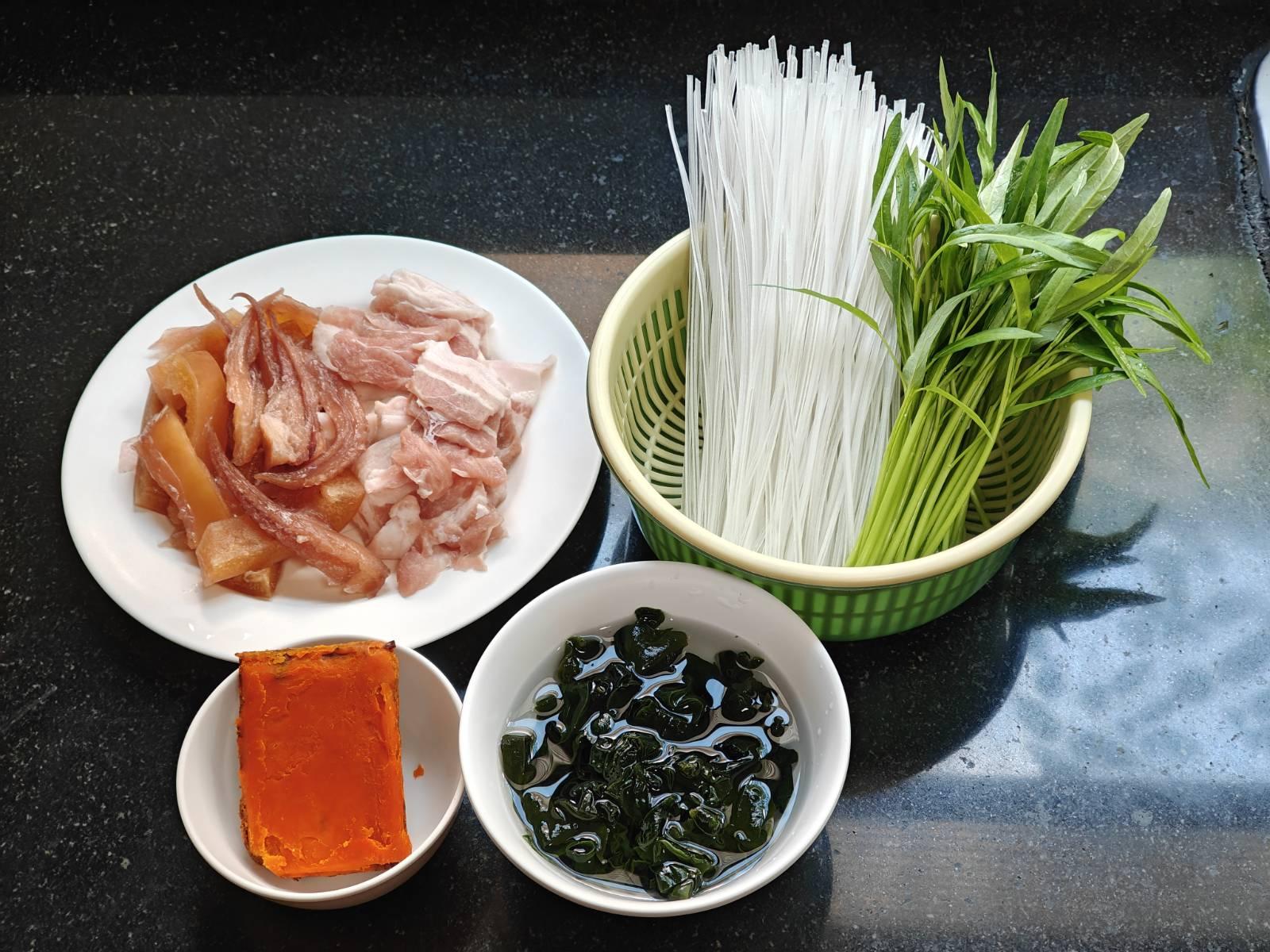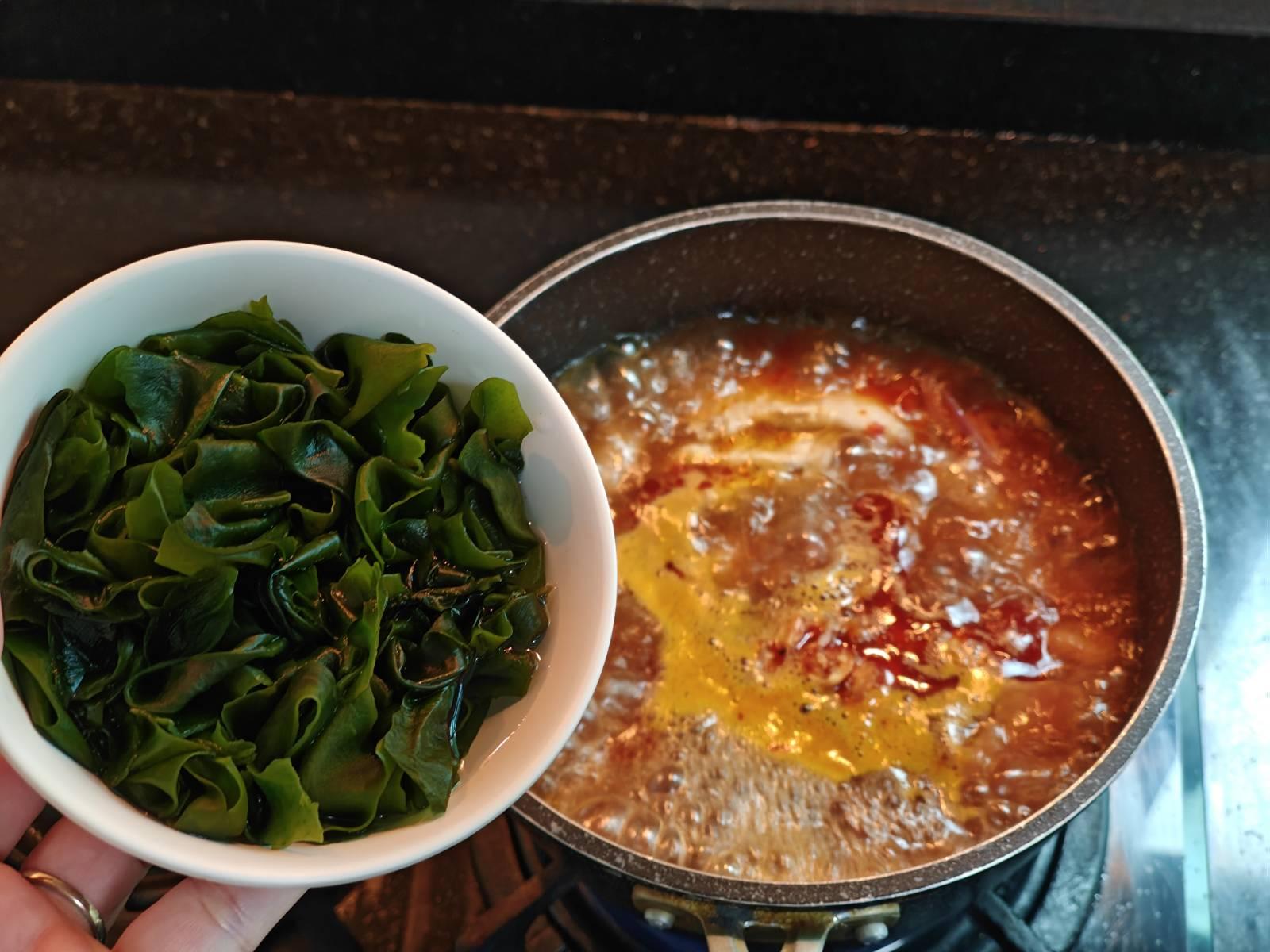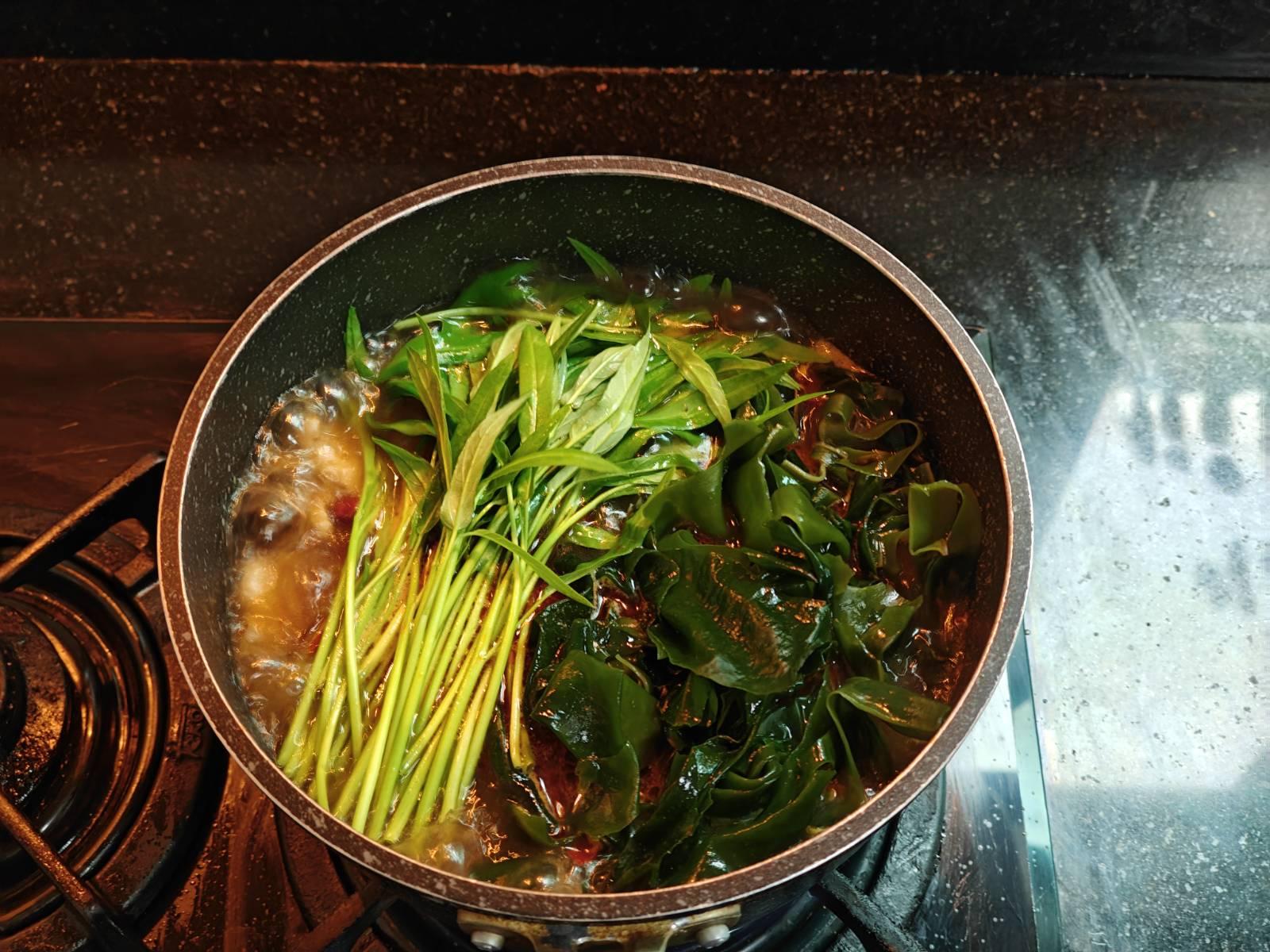 ใส่สาหร่ายวากาเมะและผักบุ้งรอเดือดเป็นอันเสร็จเรียนร้อย