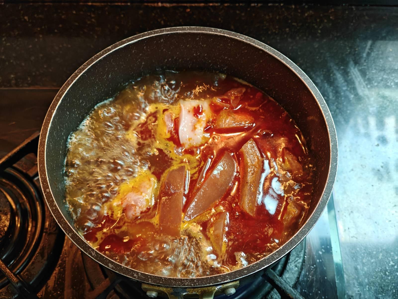 ตั้งหม้อใส่น้ำซุปแล้วเปิดไฟจนน้ำซุปร้อน จากนั้นใส่ก้อนซุปหมาล่าตามลงไป