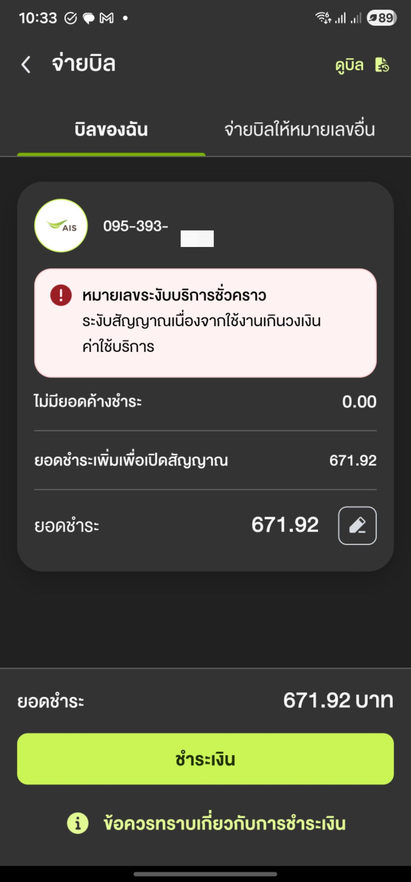 จ่ายบิลชำระไป 1 บิลแล้ว ทำไมยังขึ้นหมายเลขระงับบริการชั่วคราว อีกในแอพมายเอไอเอส