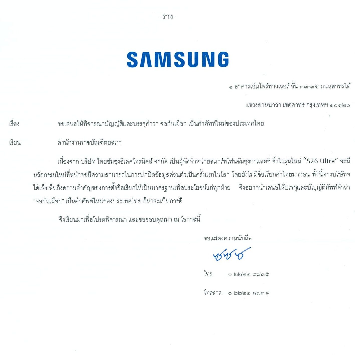 เนื่องจาก บริษัท ไทยซัมซุงอิเลคโทรนิคส์ จำกัด เป็นผู้จัดจำหน่ายสมาร์ทโฟนซัมซุงกาแลคซี่ ซึ่งในรุ่นใหม่ “S26 Ultra” จะมี