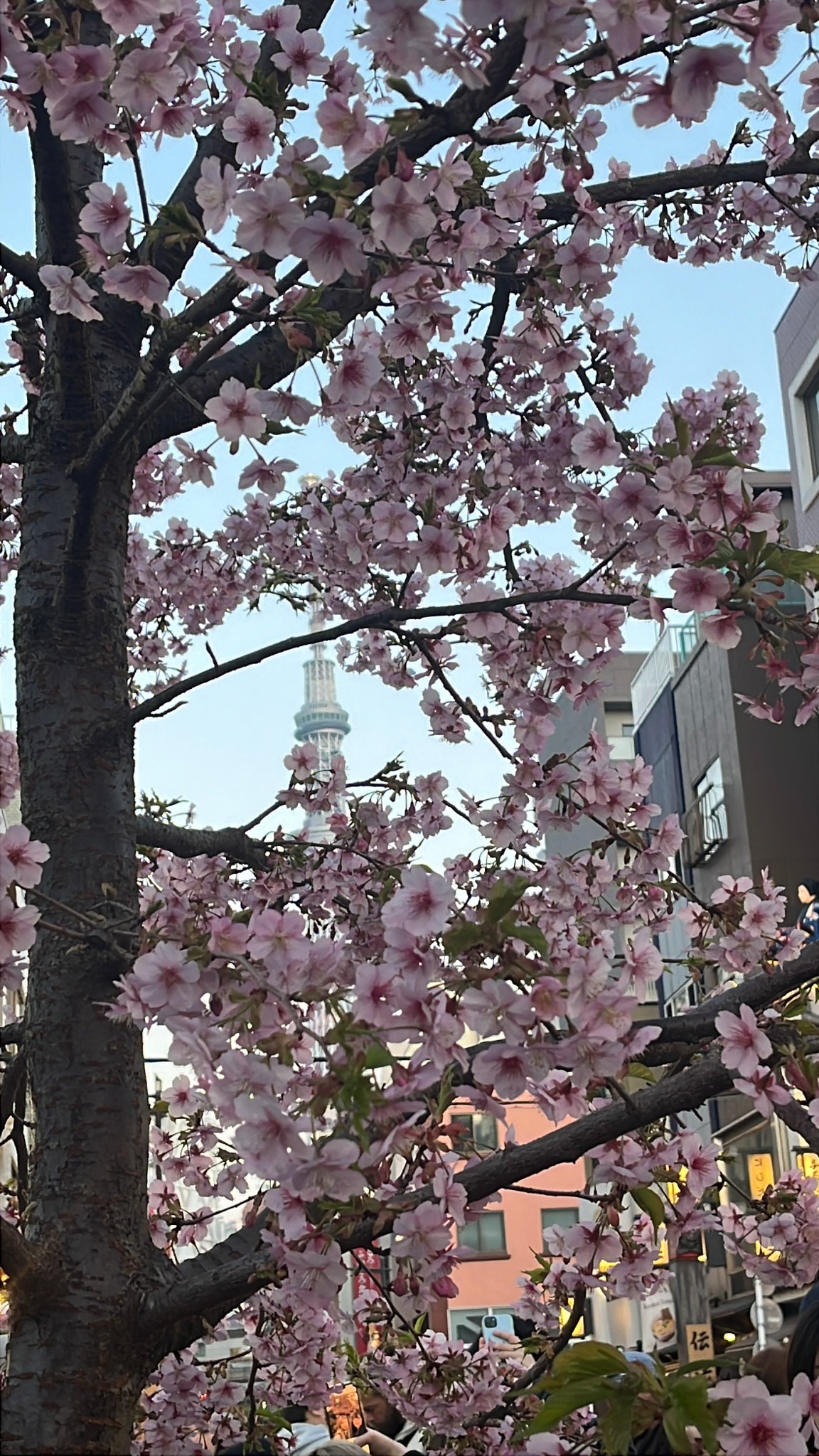 จริง ๆ มีอยู่ประมาณ 2 ต้นที่บานแล้ว ถ่ายรูปทะลุไปเห็น Skytree ด้วย คนมายืนถ่ายกันเต็มเลยยยย