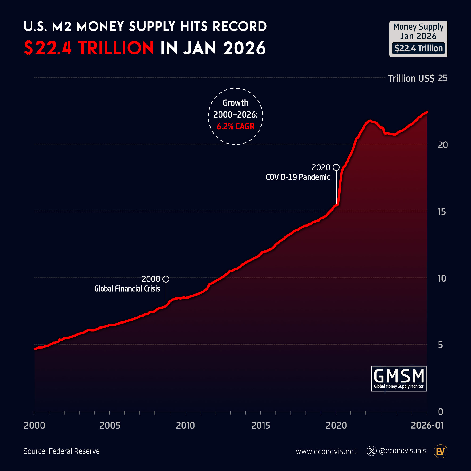 คำว่า M2 ฟังดูยาก แต่ให้จำง่ายๆ ว่ามันคือ "ปริมาณเงินทั้งหมดในระบบ" ครับ ตั้งแต่ปี 2020 เป็นต้นมา โลกเรามีเงินพุ่งขึ้นมาสูงเป็นประวัติการณ์ ($22.4 Trillion)