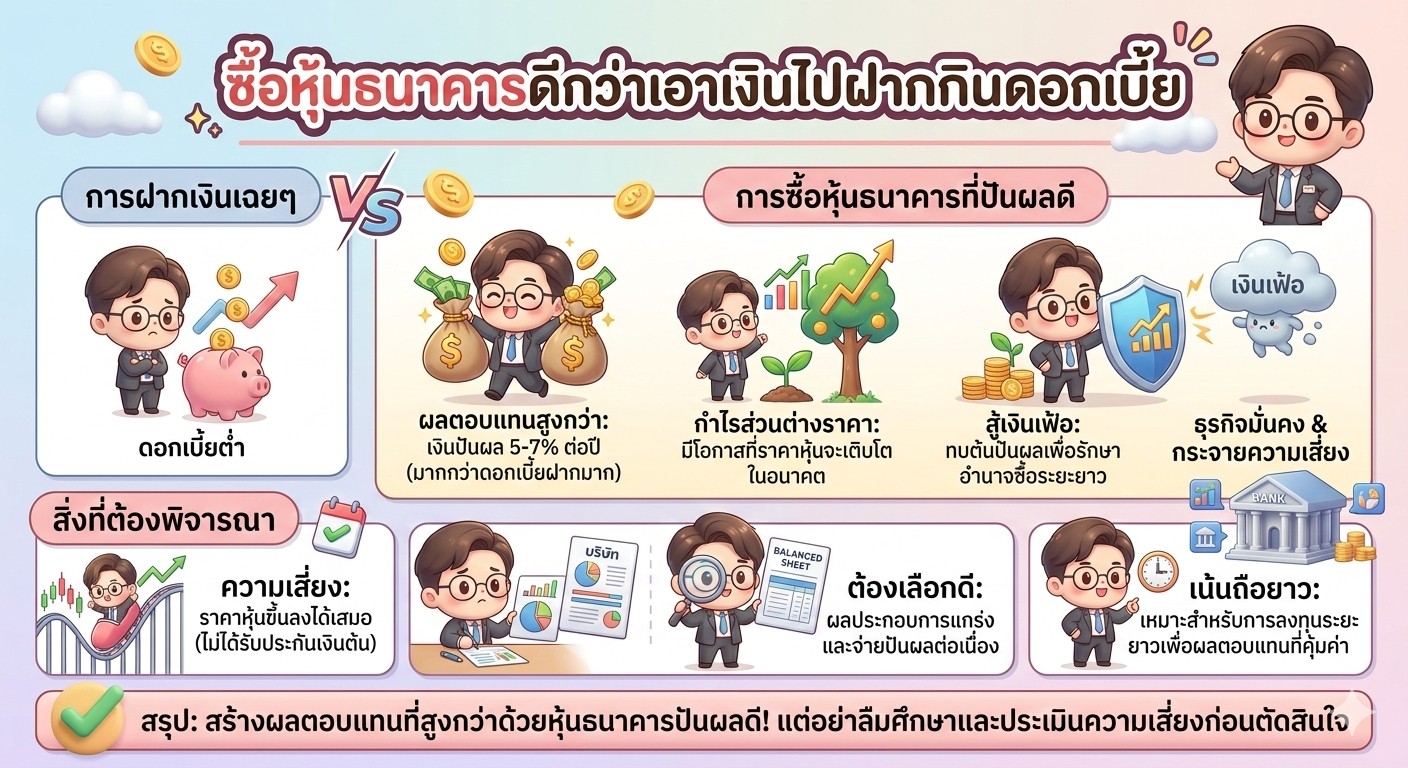 ผลตอบแทนจากเงินปันผลที่สูงกว่า: หุ้นธนาคารมักจะมีการจ่ายเงินปันผลในอัตราที่สูงกว่าดอกเบี้ยเงินฝากธนาคารอย่างเห็นได้ชัด บางธนาคารอาจจ่ายเงินปันผลสูงถึง 5-7% ต่อปีเลยทีเดียว